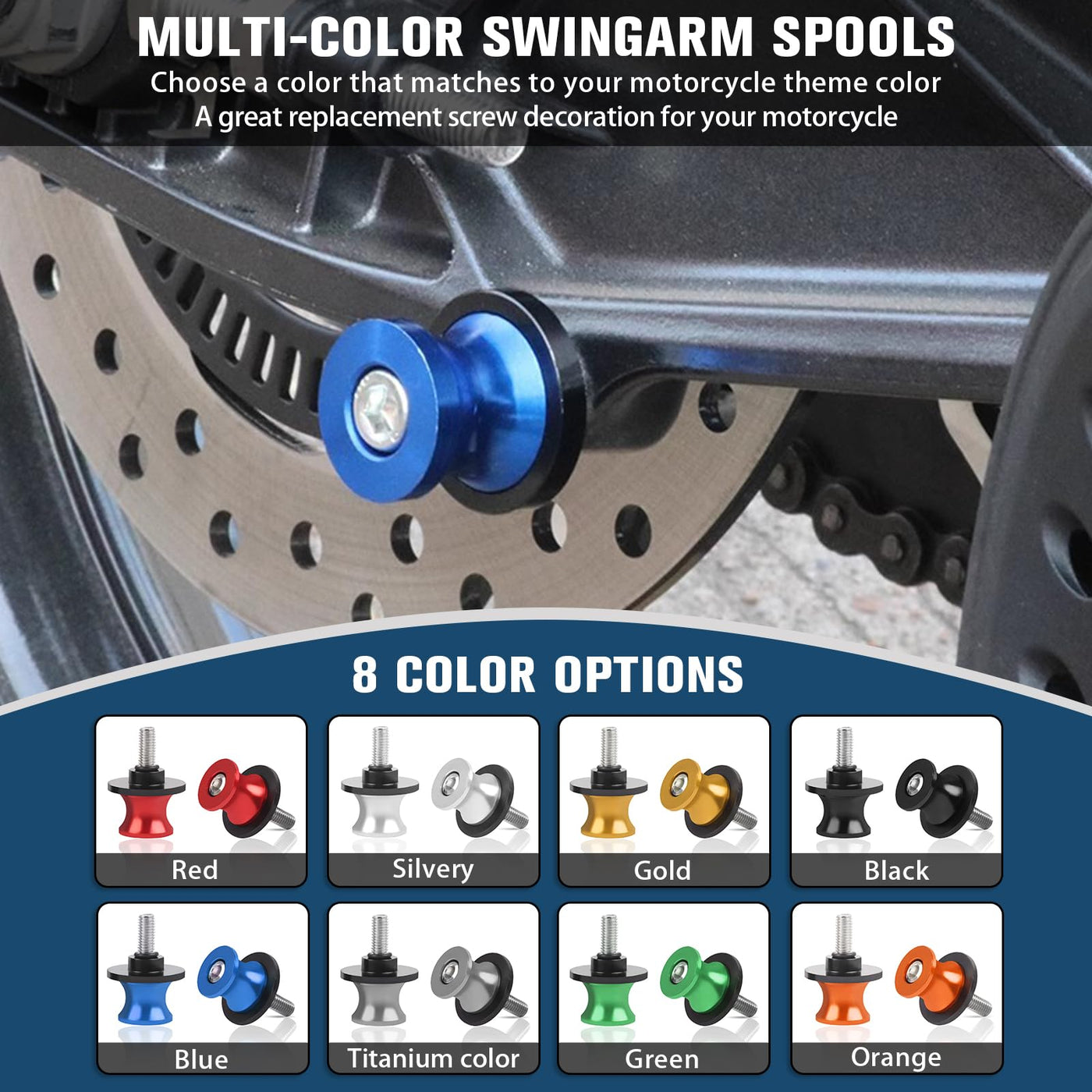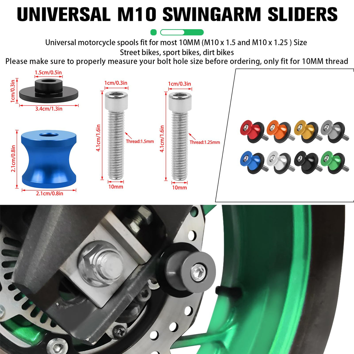 Multi-color Motorcycle Swing Arm Spools Sliders FUNCTION : swing arm sliders are design to used with the swing arm so that you can easily make your motorcycle up and down, avoid to damage the body of your motorbike while you stop it or repair it FITMENT: motorcycle swing arm spools fit for most 10MM (M10 x 1.5 and M10 x 1.25 ) size street bikes, sport bikes, dirt bikes. Please make sure to properly measure your bolt hole size before ordering, only fit for 10MM threadM10 swingarm stand screw are also fit for the models below but not limited at compatible with VULCAN S 650 900 2015 - 2020// Z750 2003-2014// Z750S 2005-2013// Z750R 2011-2013//ER-6F ER-6N 2006-2012// Versys 1000 2012-2015// Versys 650 KLE650 2008-2013// Z250/SL 2013-2015// Ninja 250 2008 - 2016// Ninja 300 2013-2016// Ninja 750R ZX750 1987 - 1990// Ninja ZX-10R zx1000 2004 - 2012// Ninja ZX-12R ZX1200 2000 - 2007// Ninja ZX-14 zx1400 ZZR1400 2006 - 2014 // Ninja ZX-6 ZX600 1998 - 2002 Choose a color that matches to your motorcycle theme color Material: new and sturdy CNC Aluminum Condition: good Package includes:2 pcs swing arm spool sliders with 4 screws( 2 pc M10x 1.5mm and 2 pc M10x 1.25mm thread screws)