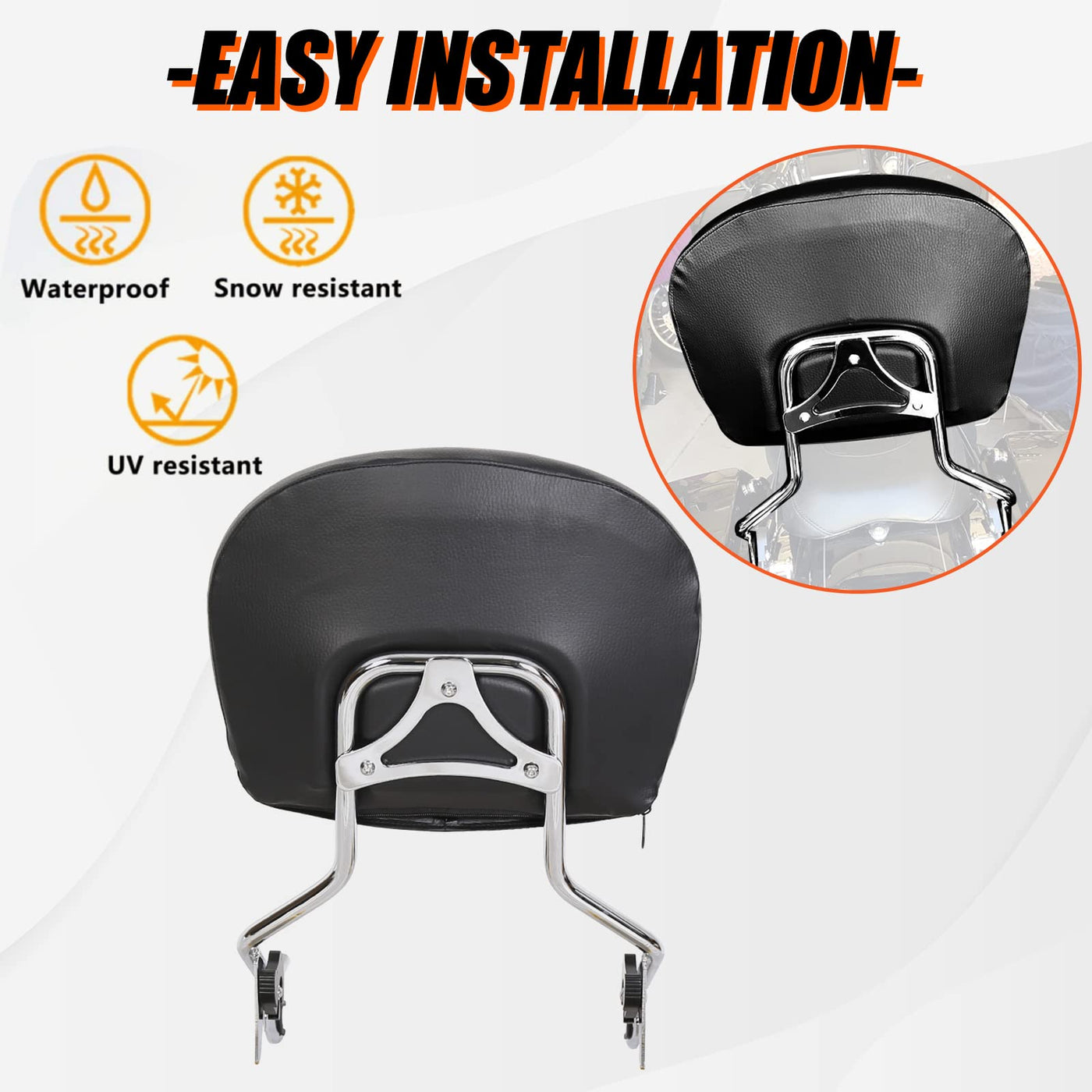 Q: What materials are used in the construction of this sissy bar backrest?A: The backrest is made of soft and comfortable artificial leather that is breathable and wear-resistant. The frame is constructed from durable steel with a chrome-plated finish, providing resistance to rust and ensuring longevity.