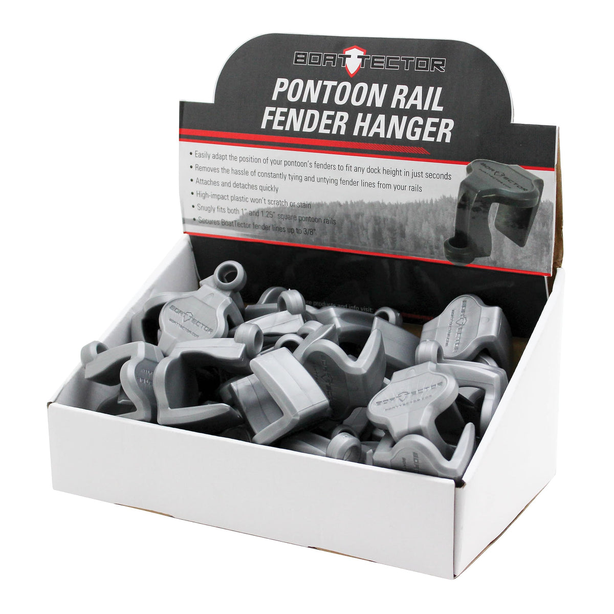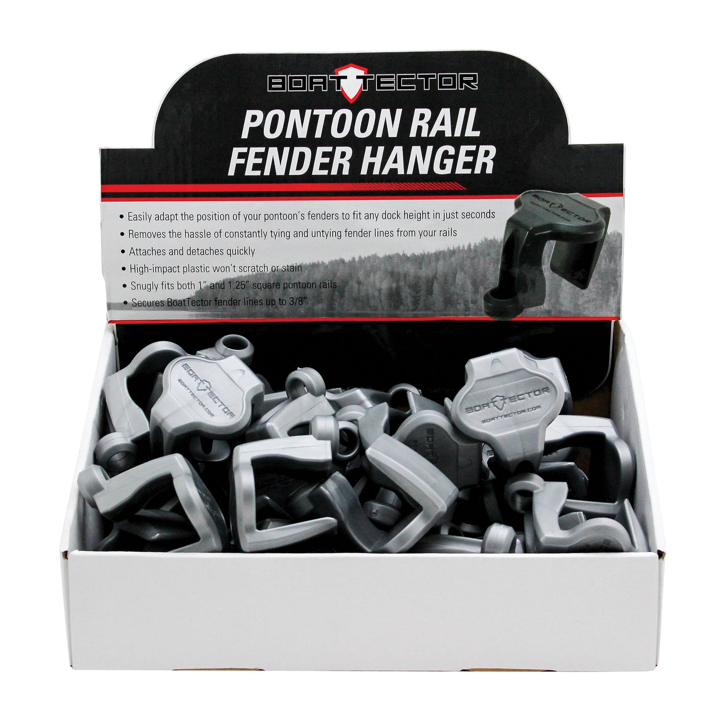 Easily attach and reposition your BoatTector Fenders with the BoatTector Pontoon Rail Fender Hanger/Adjuster. Fitting 1.25 square pontoon rails, the fender clip slides over the top of the rail giving you the simplest fender attachment and adjustability . Run the fender line up through the clips opening, adjust the fender to the appropriate height, tie a simple knot and be on your way. The clip is made of high-impact ABS plastic that will not scratch or stain your pontoon rails and fits fender lines up to 3/8.
