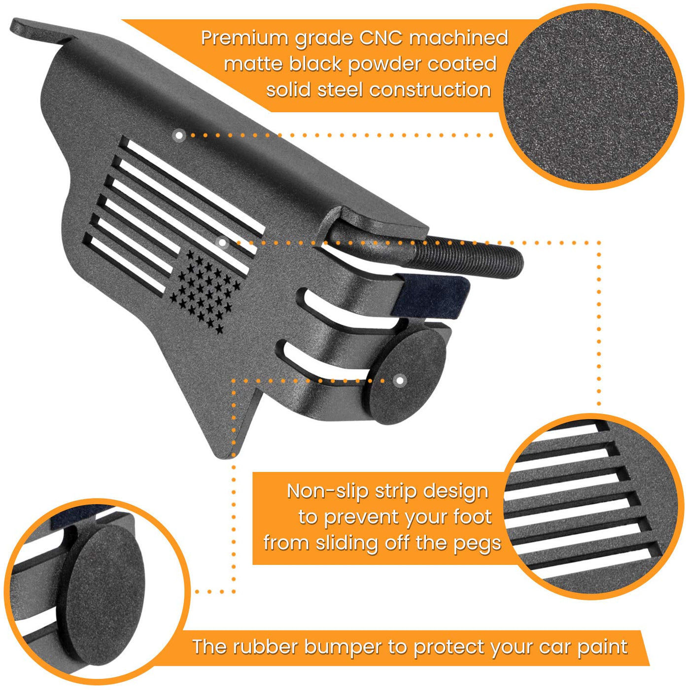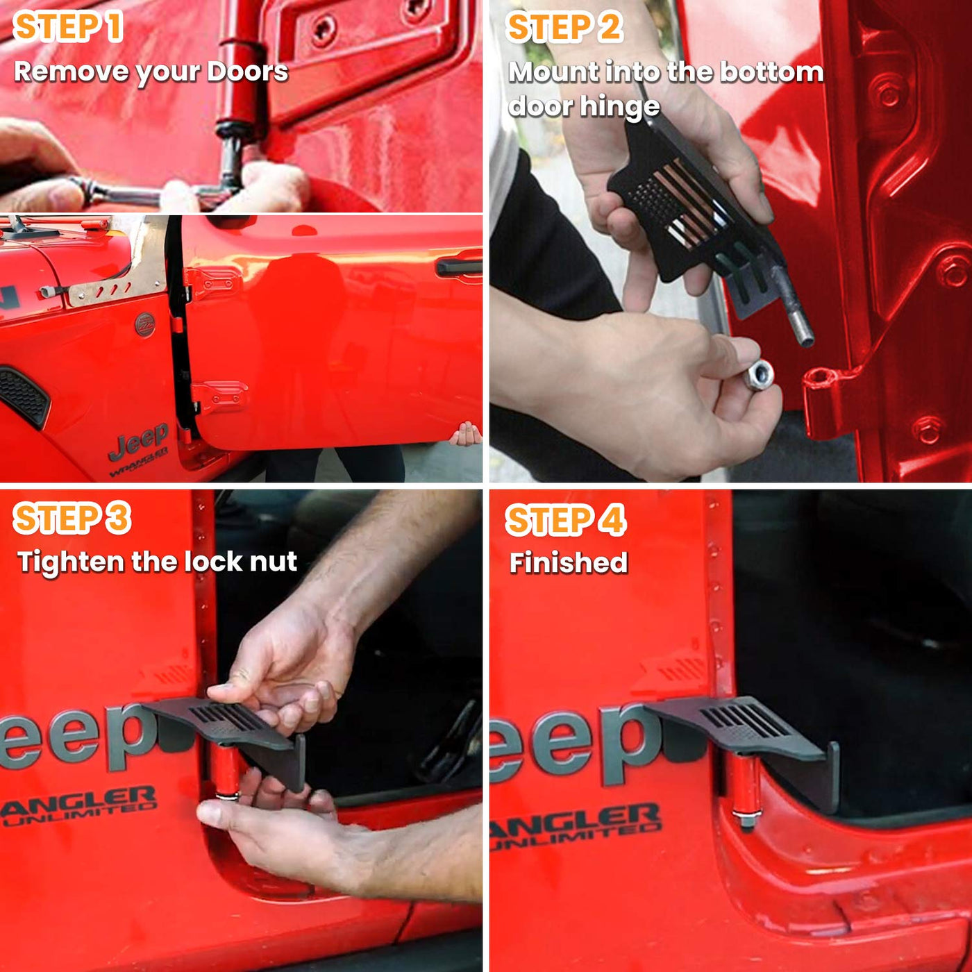 Q: How do I install the foot pegs on my Jeep Wrangler?A: Installation is straightforward and requires no drilling. Simply remove your door, mount the foot pegs into the door hinge, and tighten the lock nut for secure placement.