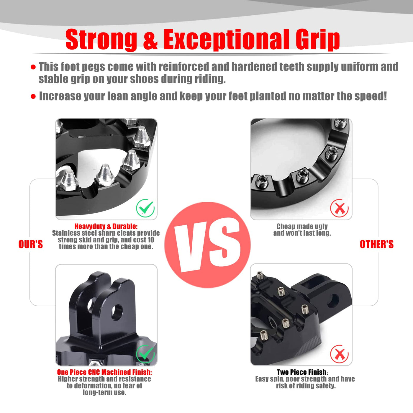 Q: What makes Goldfire foot pegs different from other brands?A: Goldfire foot pegs stand out due to their one-piece construction, which offers greater strength and stability compared to two-piece designs. They provide superior grip and control through their unique screw-tooth design, and are made from high-quality materials to withstand the rigors of riding.