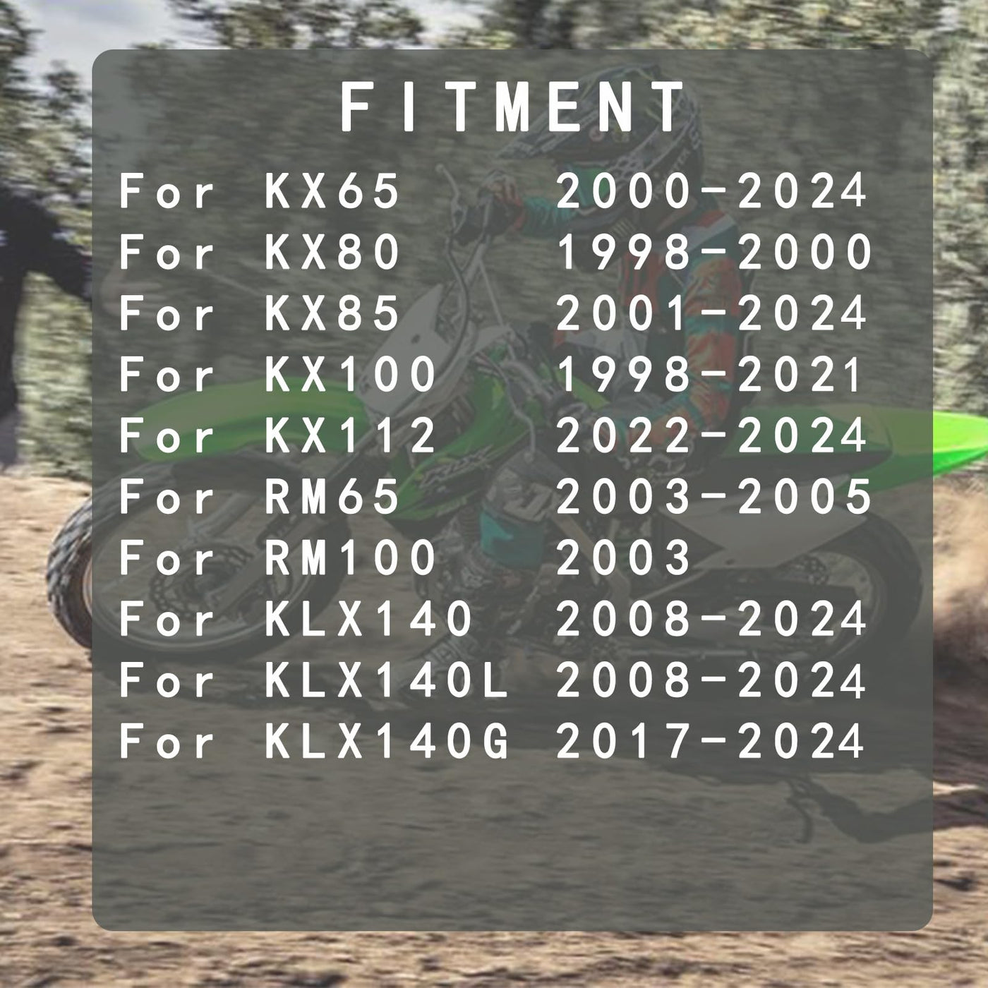 Q: What motorcycle models are compatible with the JFG RACING Foot Pegs?A: The JFG RACING Motorcycle Foot Pegs are compatible with several models, including KX65 (2000-2024), KX80 (1998-2000), KX85 (2001-2024), KX100 (1998-2021), KX112 (2022-2024), KLX140/KLX140L (2008-2024), KLX140G (2017-2024), RM65 (2003-2005), and RM100 (2003).