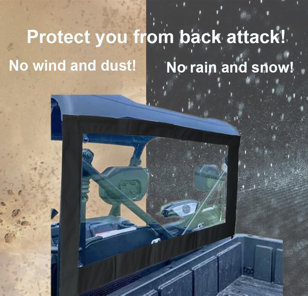 Q: How does the rear windshield protect against weather elements?A: This rear windshield is made with durable two-layer 600D Oxford Fabric and a high-quality HD PVC film, offering protection against UV rays, wind, rain, dust, and debris, ensuring a comfortable and safe driving experience.