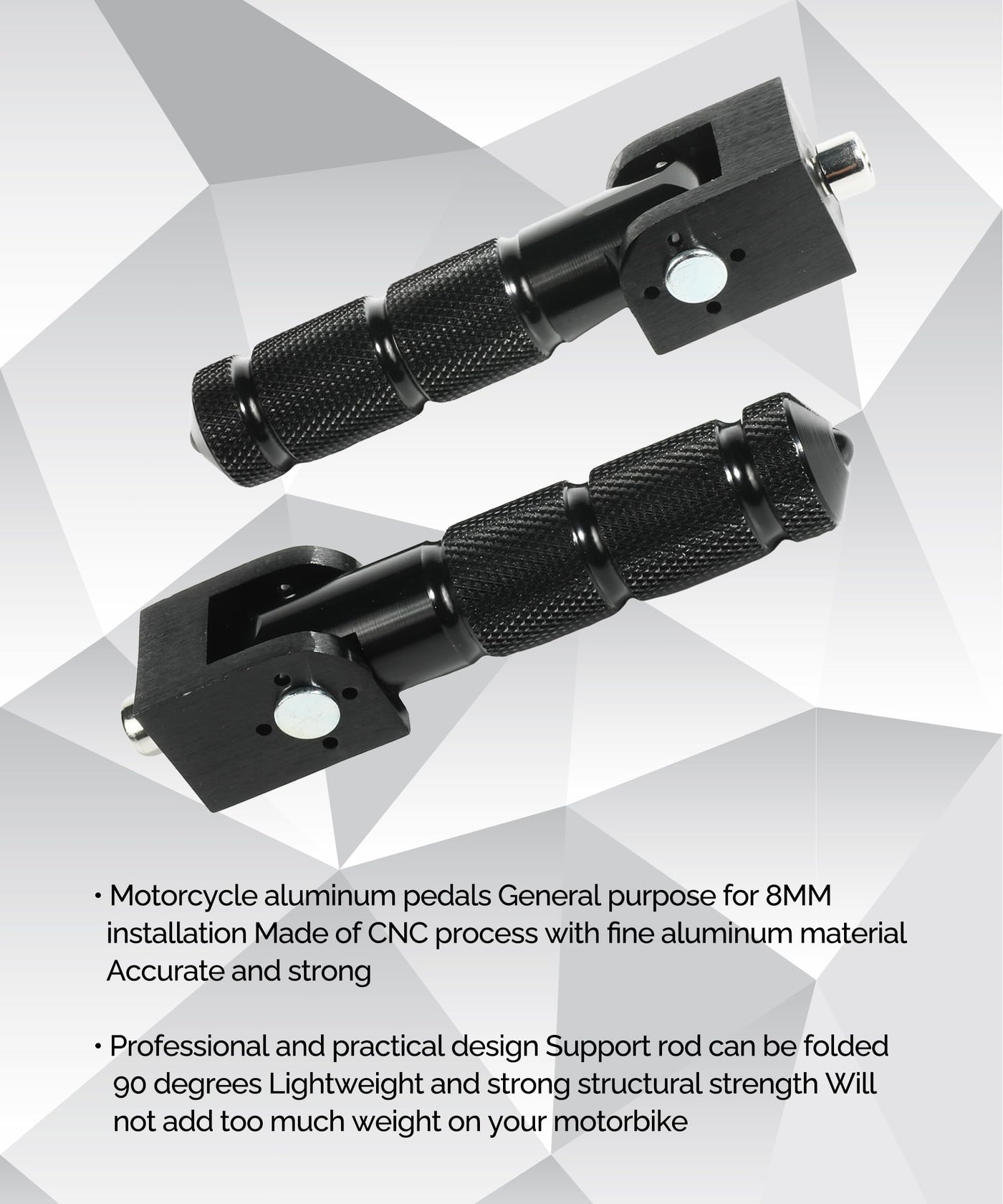 Material:< /b> Aluminum alloy< br > Dimensions: < /b>5.1 inches and 5.7 inches< br > < br > What will you get in the box?< /b>< br > -1 pair of motorcycle pedals< br > < br > Our product advantages:< /b>< br > -Made of CNC processed aluminum alloy, anodized to prevent oxidation and scratches< br > -Lightweight, high structural strength, no increase in motorcycle weight, durable and durable< br > -The knurled anti slip design provides passengers with great safety and comfort< br > -Add a touch of elegance to your motorcycle and enhance its body grade< br > -The front pedal rebounds, the rear pedal is 90 degrees, and the support rod can be folded and fixed by 90 degrees< br >