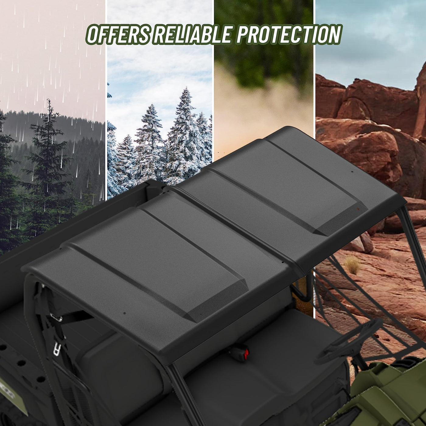 Q: What materials are used in the construction of the roof?A: The roof is made of high-quality, rugged, scratch-resistant high-density polyethylene, ensuring durability and protection during off-road adventures.