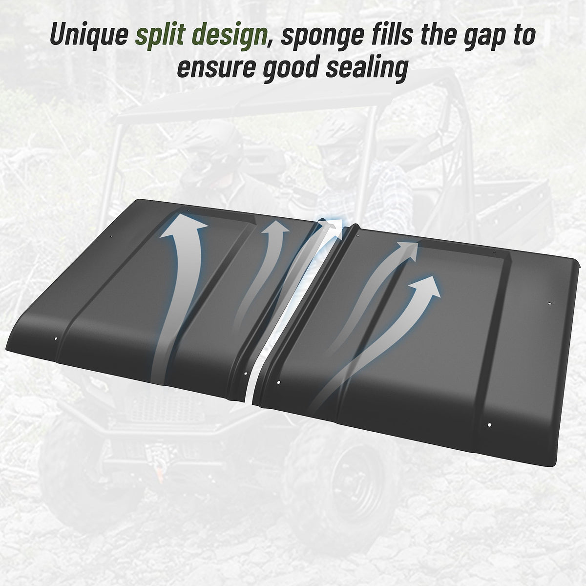 Q: What is the unique feature of the roof's design?A: The roof features a unique 2-piece combination design with sponge filling to ensure good sealing, which matches your vehicle perfectly while minimizing air resistance.
