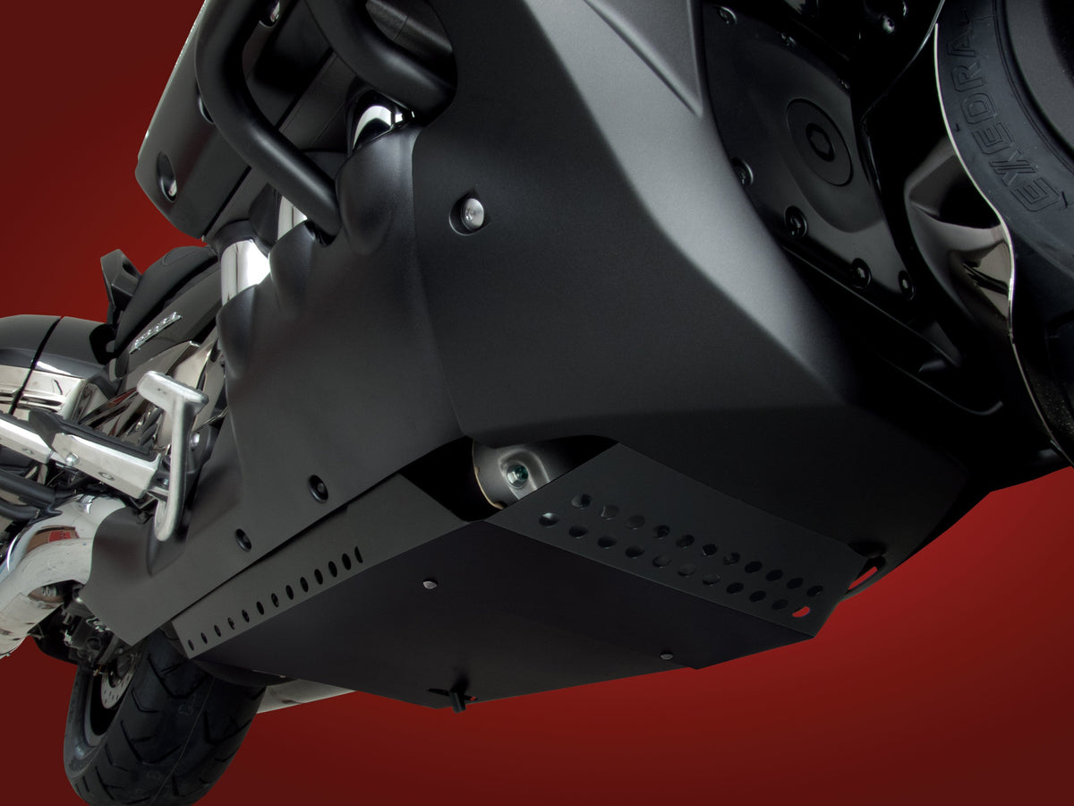 Q: How does the belly pan improve airflow and reduce wind drag?A: The custom-engineered perforation pattern of the belly pan enhances ventilation, allowing for better airflow, which reduces wind drag and buffeting while riding at highway speeds.