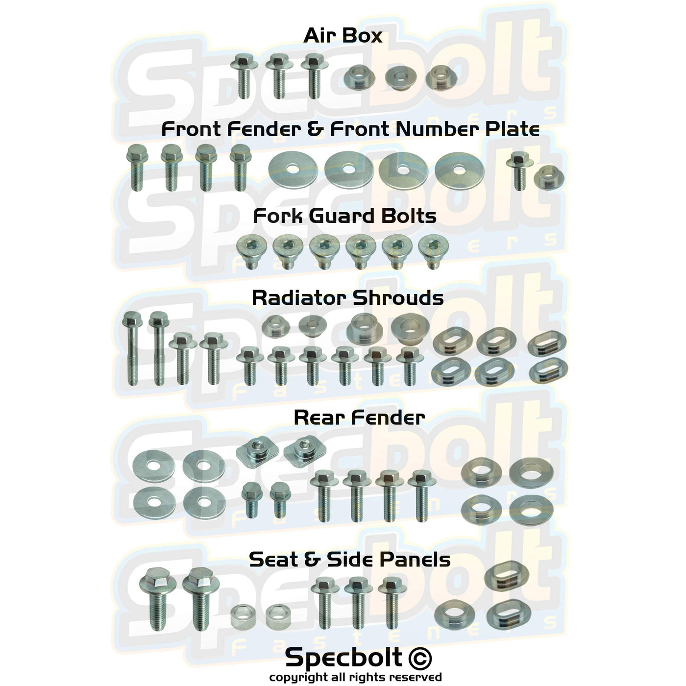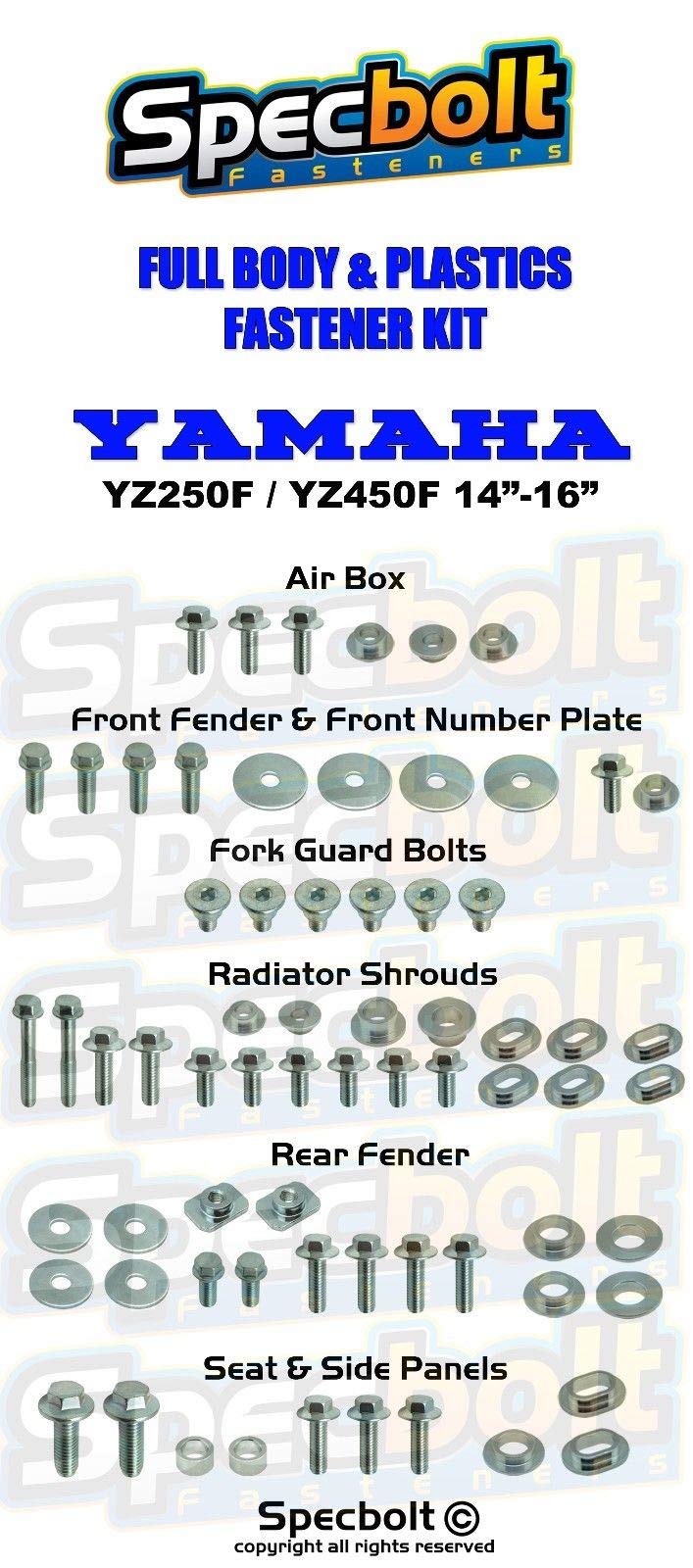 Specbolt Plastics Fastener Kit Fits Yamaha Yz250F/Wr450F Comes With Full Instructions This High Quality Oem Style Bolt Kit Fits All... Yz250F 2014-2016 Yz450F 2014-2016 Replace All Of Your Yzf'S Plastics / Body Panel Fasteners At Once. Use These Correct Original Style Fasteners. This Is The Complete Kit And Includes Everything!! Includes All The Hard To Get Oval Cnc Aluminum Bushings. Includes An Individual Factory Match Fastener Assortment For Each Of The Following: Air Box Front Fender & Number Plate Fork Guards Radiator Shrouds Rear Fender Seat & Side Panels