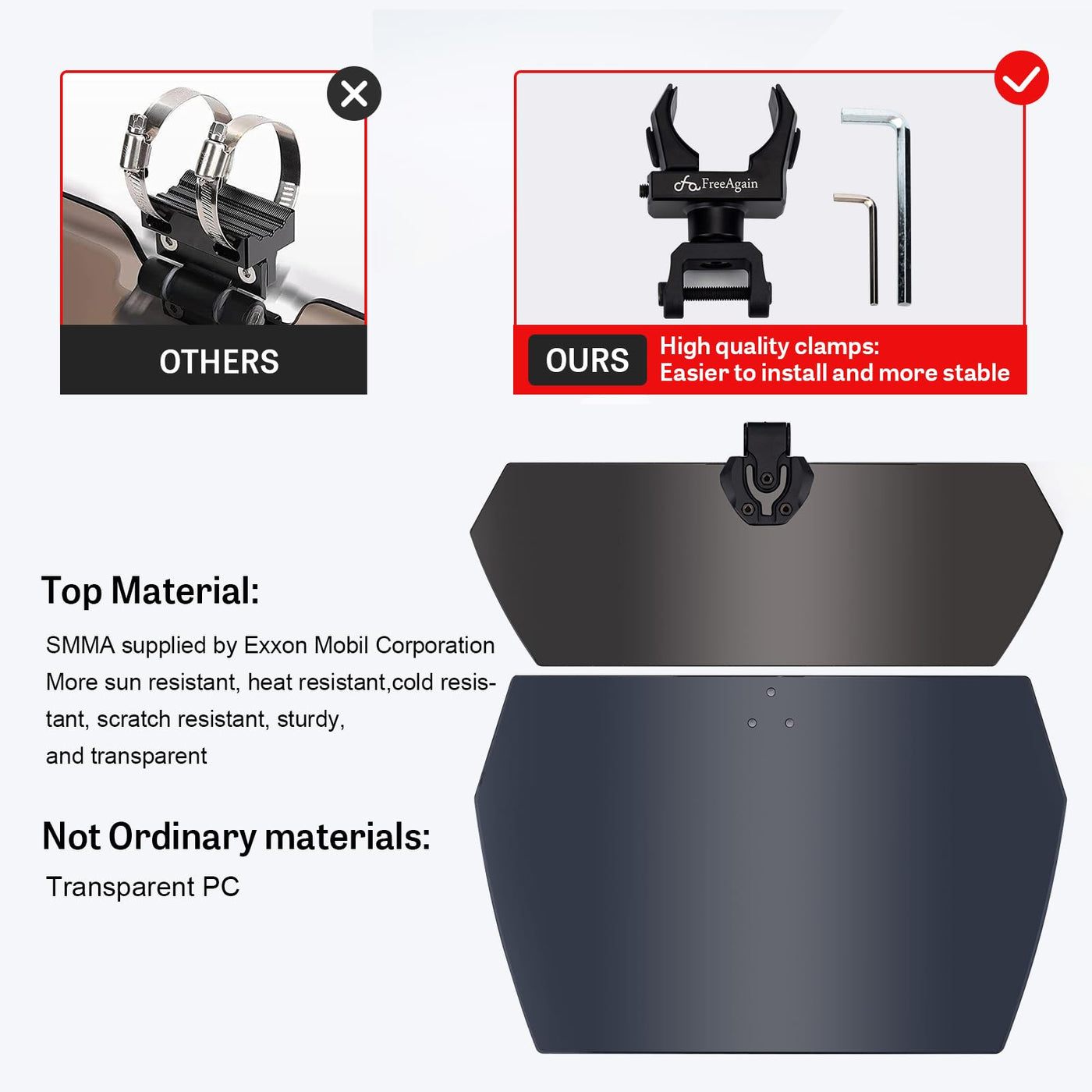 Q: What material is the FreeAgain Sun Visor made from?A: The FreeAgain Sun Visor is made from high-quality acrylic, which provides durability and a lightweight structure, ensuring that it can withstand outdoor conditions while maintaining its functionality.