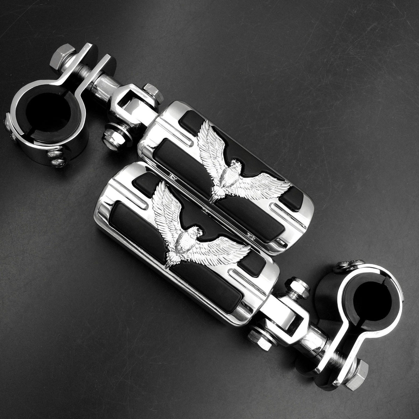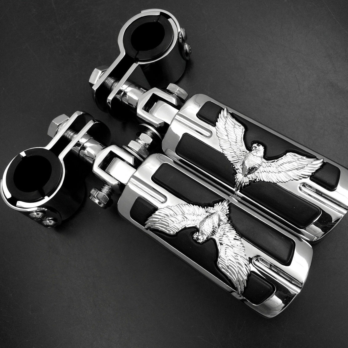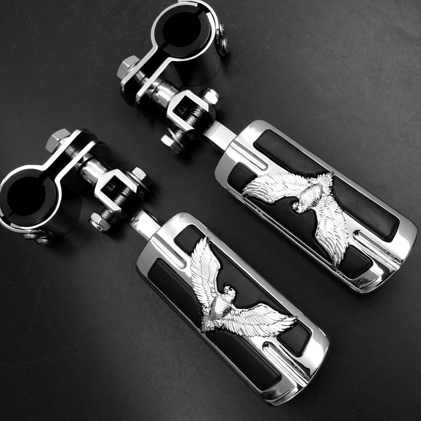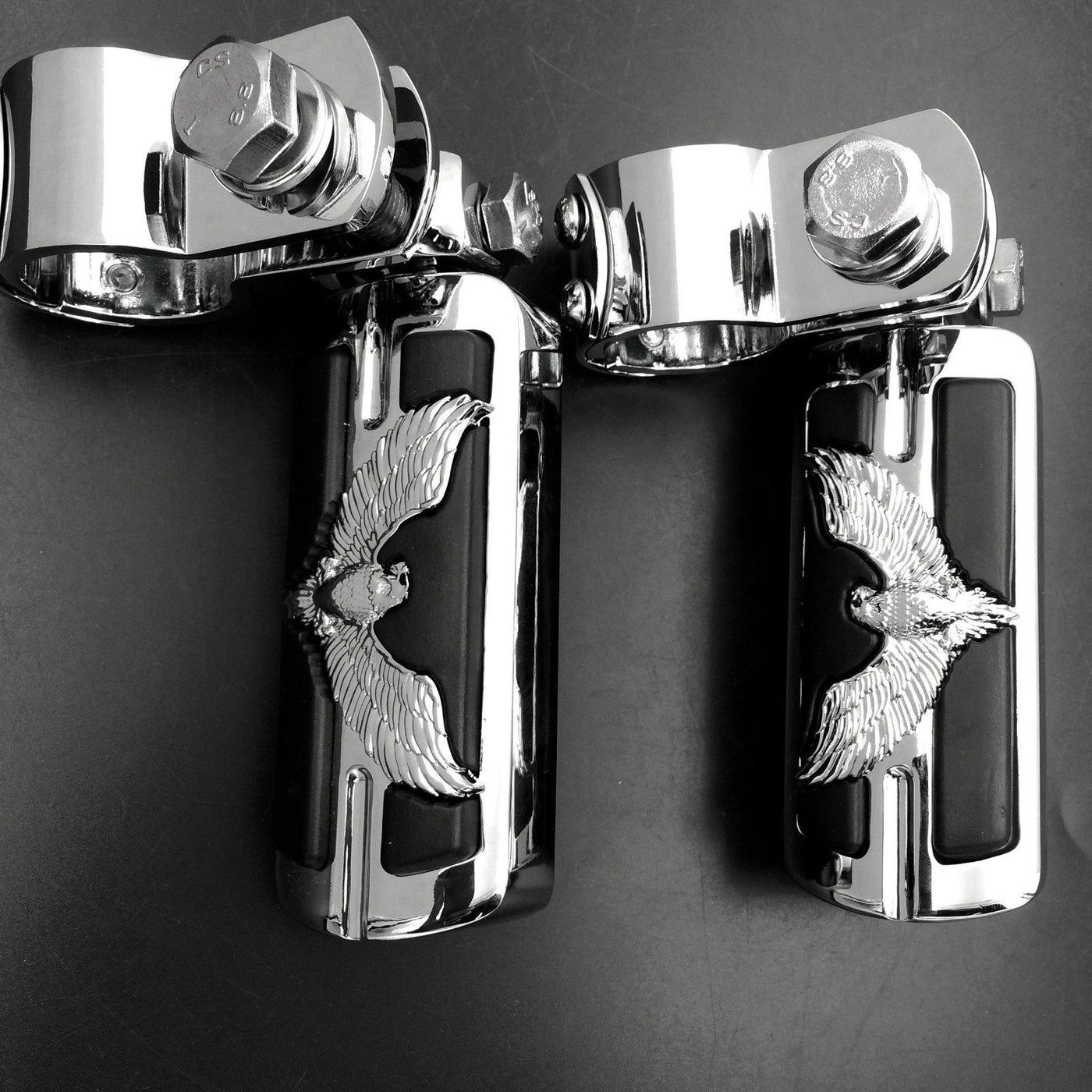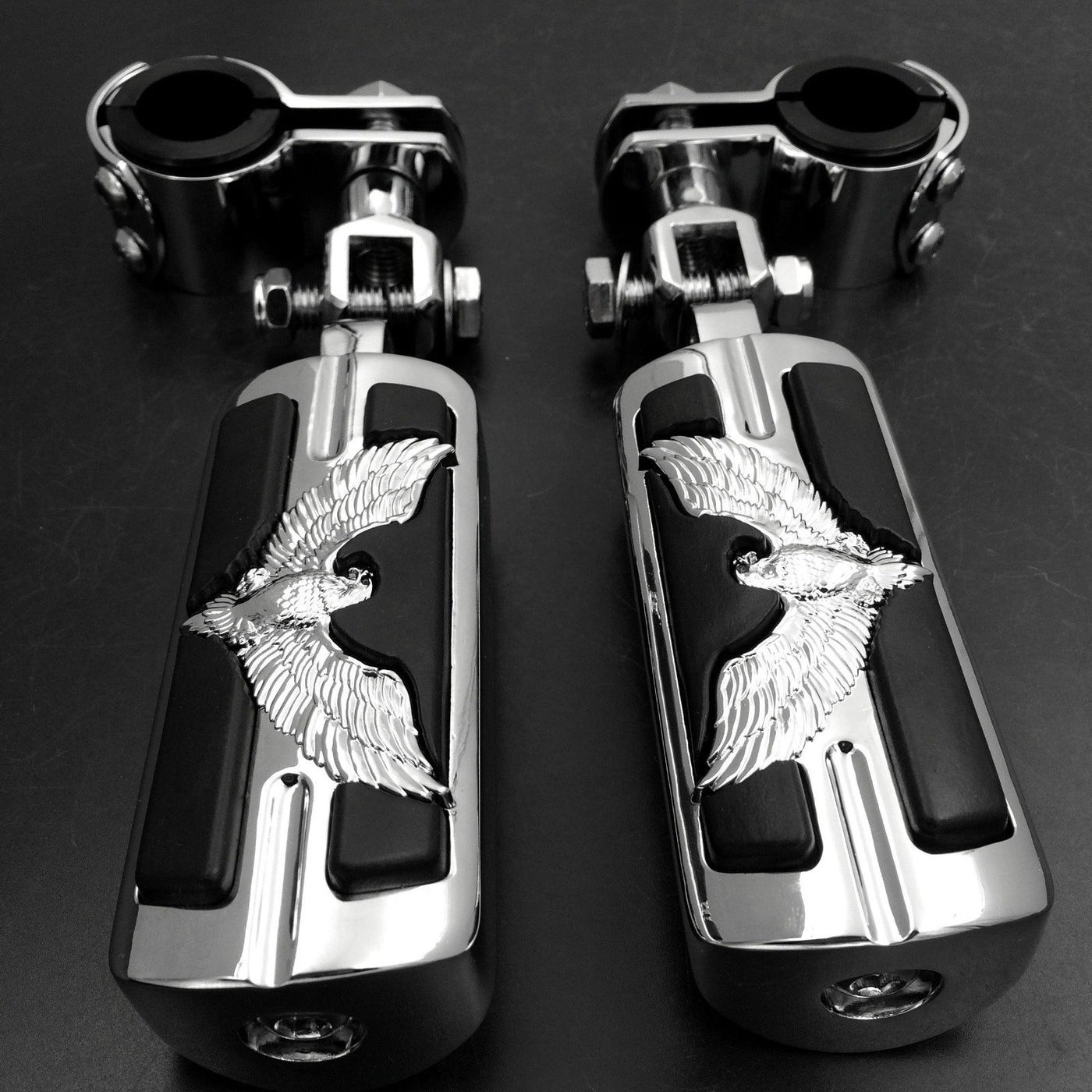 Fitment:Fits any bikes with 25mm - 31.25mm (1'' ~ 1 1/4'') engine guard or frame tubeGreat for Harley Davidson///Kawasaki/BSA/Norton/Triumph Bobber,Chopper,Cafe racer,ATV,UTV,Scooter,etc GoldWing GL1800 2001-2011 GoldWing GL1500 GL1100 GL1200 VT750 Shadow 750 VT750C ACE VT1100 VTX1300 VTX1800 Magna 750 VF750 VF1100 VLX600 DLX600 Shadow 600 VT600 Shadow 400 steed400 valkyrie 1800 2004 2005 1998 1999 2000 2001 2002 2003 ValkyrieTRIUMPH ROCKET 3 2300ccHarley-Davidson Sportster 883 xl1200 1340V-STAR XVS1300 XVS650 XVS950 XVS1100XV1600 XV1700 XV1900 XVS1900XV250 XV400 XV535 XV750 XV1100 VirageRoadstar xv1700SUZUKI VL1500 VL800 VZ800 VL125 VL250SUZUKI VS1400 VZ1500 INTRUDER M800 C800SUZUKI INTRUDER C1800RT M109R C109RSUZUKI BOULEVARD M90 S50 M50Z C90 M1500KAWASAKI VULCAN VN400 VN800 VN900 VN1500 VN2000 These Highway pegs allow riders a range of adjustment that is not possible with other clamp-on style highway pegs. The offset can be rotated 360 in a 7''diameter circle to accommodate tall ,short ,or averafe heights riders.These can be installed on any round tubing (frames or engine guards),but it is important to keep in mind that the footpeg itself will end up perpendicular to the bar to which it is mounted.