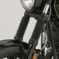 Q: What materials are used in the construction of these fork gaiters?A: These fork gaiters are made from durable rubber, providing excellent protection against road debris while maintaining a classic look.