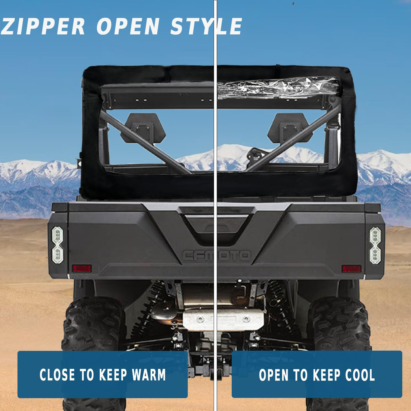 Q: How does the zipper design work on the YONQIFON rear windshield?A: The upgraded zipper design allows you to easily roll up the window part of the windshield without needing to remove the entire structure, providing versatility based on weather conditions.