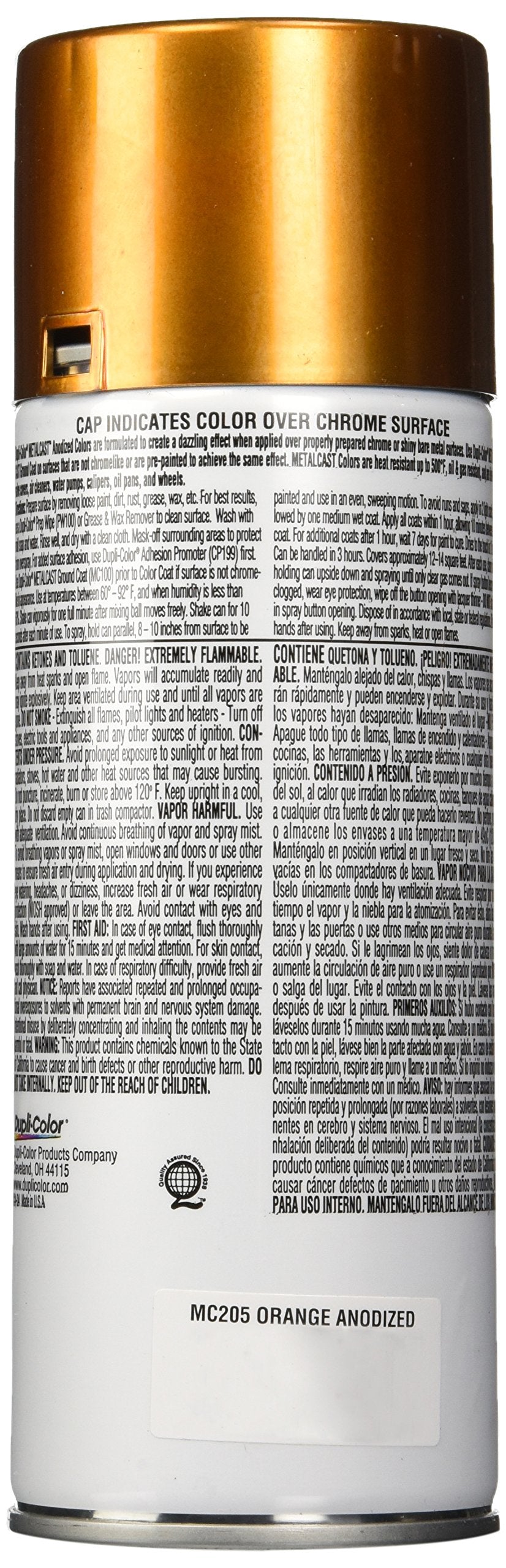 Dupli-Color Metalcast Anodized Coating Automotive Spray Paint turns ordinary chrome pieces into a bright, transparent-colored metallic finish in an easy one-step process. This high gloss, orange copper vehicle spray paint has a durable enamel finish and is oil, gas, and heat resistance up to 500°F intermittently. Featuring a EZ Touch Fan Spray Nozzle, this high heat car paint is easy to use and ensures maximum coverage on chrome automotive accessories. It’s dry to the touch in 30 minutes and can be handled in 1 hour. Ideal for interior, exterior, and high-heat applications under-the-hood in cars, trucks, ATV, UTV’s and more. This Dupli-Color spray paint is specially formulated to work over properly prepared shiny, bare metal, and faux chrome-like surfaces. Metalcast is the answer to dressing up your chrome and metal surfaces. To achieve the anodized metal look on non-metal or painted surfaces, first prime with the high heat resistant, fast drying ground coat Metalcast 100 (sold separately). Since 1938, Dupli-Color has been the trusted brand leader in providing easy-to-use, innovative products to restore, restyle and protect their vehicle appearance.
