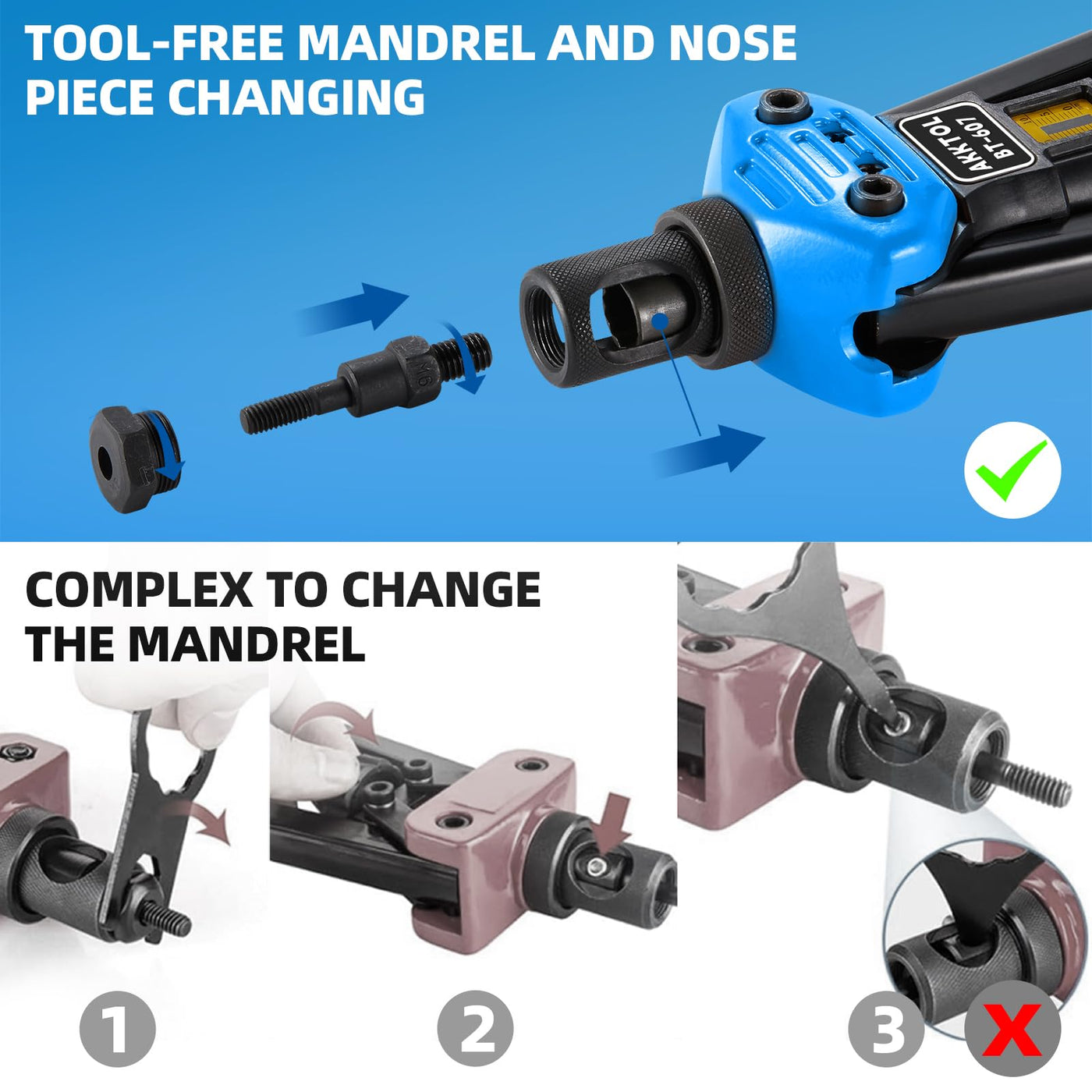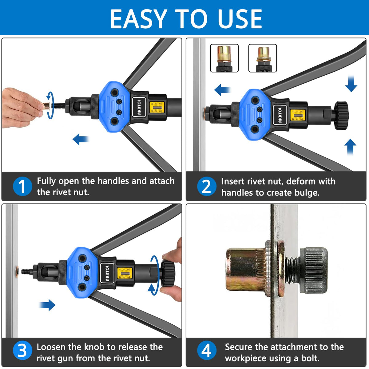 Q: Is the AKKTOL Rivet Nut Tool suitable for beginners?A: Yes, the AKKTOL Rivet Nut Tool is designed for ease of use, featuring a knurled head for quick mandrel changes and a detailed user manual that guides beginners through the installation process.