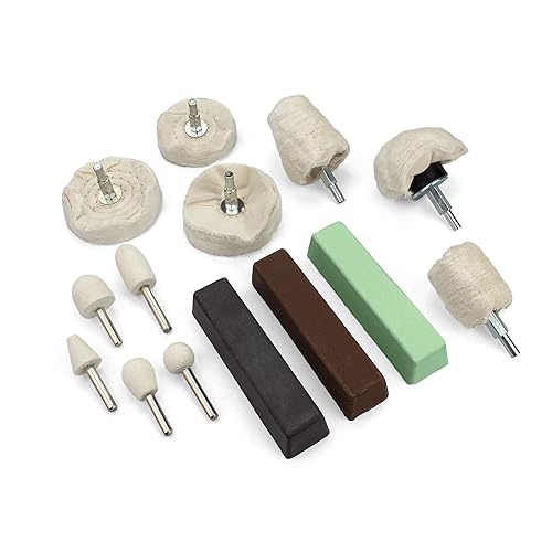 Q: What items are included in the ENKAY Stainless Steel Polishing Kit?A: The kit includes (1) Black Emery compound, (1) Brown Tripoli compound, (1) Green Stainless Steel polishing compound, (2) Spiral Sewn buffing wheels, (1) Loose Cotton buffing wheel, (3) specially shaped buffing wheels, and (5) felt cones for polishing hard-to-reach areas.