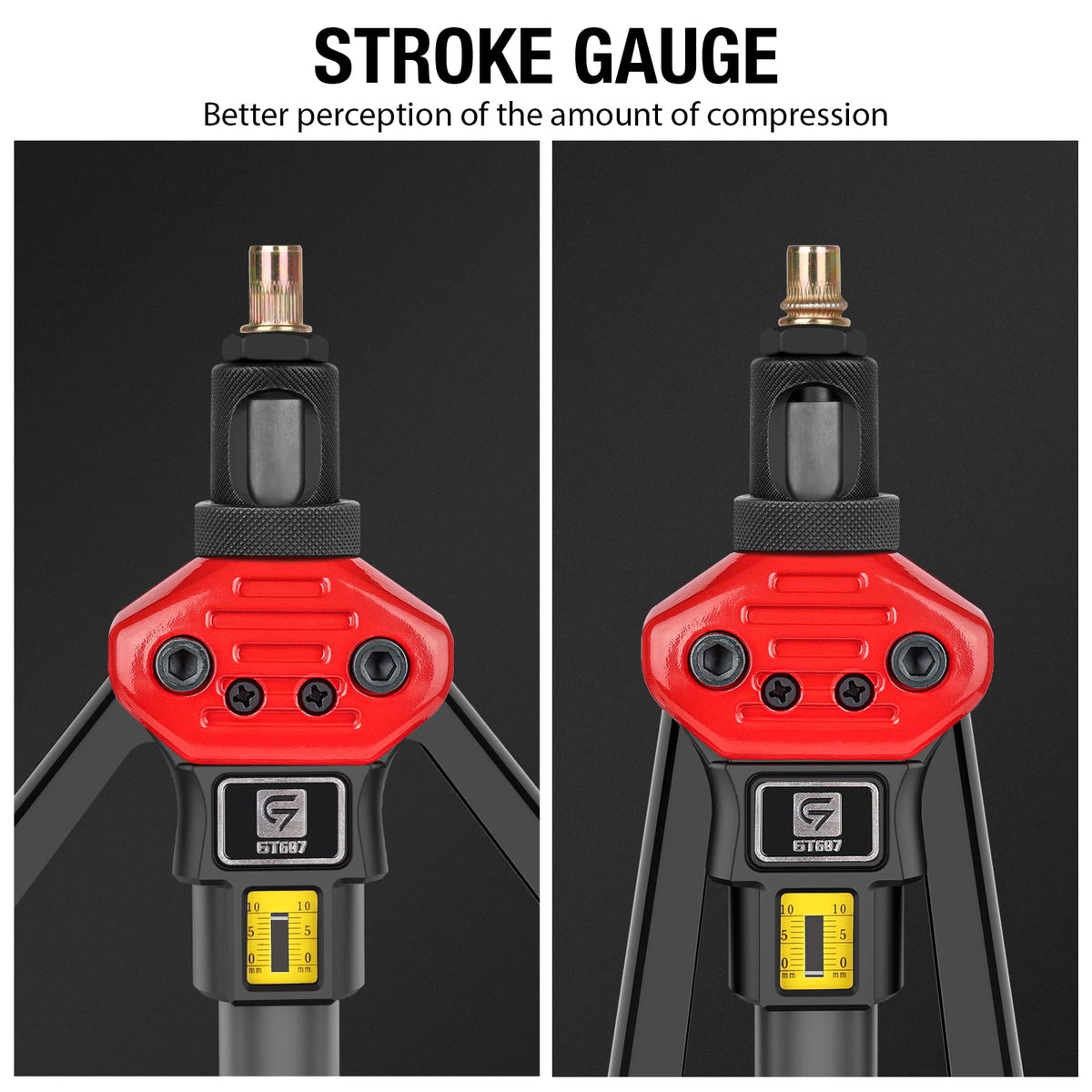 About GIANTISAN GIANTISAN consistently provides more innovative, stronger and exquisite tools to improve our world. GIANTISAN consists of the word Giant and Artisan, believing in that everyone can be a giant of a artisan with the right tools to equip themselves. About GT607 The 16'' newly produced rivet nut tool is an integration of several latest design concepts- simple using, effort saving, high reliability and comfortability of ergonomic design. Its design and long arm enable you to save 50% effort than normal rivet tool and experience a more comfortable way of work. WARM TIPS: ? Please check the hole size before selecting mandrel and rivet nuts: M3, M4, M5, M6, M8, M10, M12, 6-32, 8-32, 10-32, 10-24, 1/4-20, 5/16-18, 3/8-16, 1/2-13 ? The rivet nut tool only applies to materials with hardness over HRC35, Iron, ABS plastic, Not suitable for fabric, billboard, ultrathin metal plate (