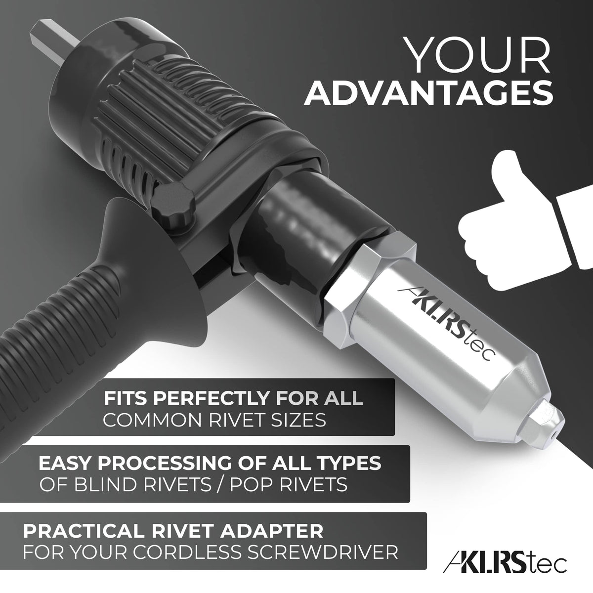 Transform your drill into a professional rivet gun - Upgrade your cordless screwdriver or drill into a powerful pop rivet tool with the KLRStec Rivet Adapter - fast, reliable, and easy to use! | Versatile for all rivet sizes - Perfectly compatible with aluminum blind rivets in shank sizes of 2.4 / 3.2 / 4.0 / 4.8 mm, making it ideal for various applications. | Durable and heavy-duty - Crafted from premium chrome-molybdenum steel (CrMo), this rivet adapter is designed to withstand intense use and last for years. | Universal compatibility - Fits all standard drills and cordless screwdrivers with a 1/4'' hex drive. Includes an easy-to-follow manual and instructional videos for seamless use! | Risk-free purchase - Backed by our 30-day money-back guarantee. If you're not 100% satisfied with your KLRStec Rivet Adapter, return it hassle-free - no questions asked!