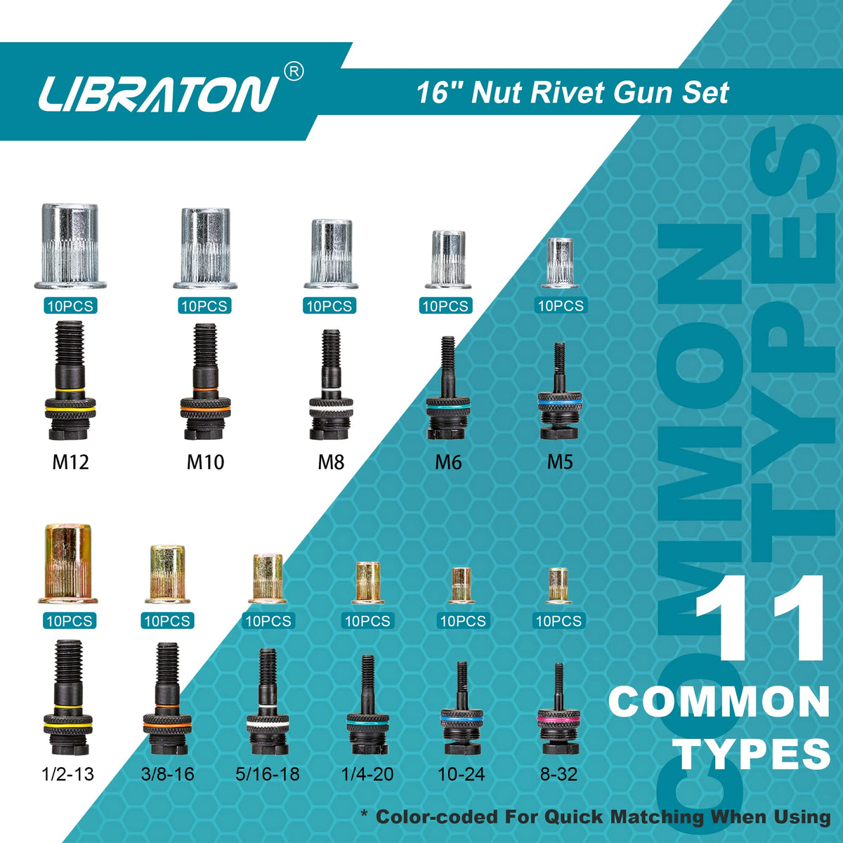 Libraton 16'' Rivet Nut Tool, Rivet Nut Gun, Hand Rivet Nut Setter With 110Pcs Rivet Nuts, 11Pcs Metric & Sae Interchangeable Ma