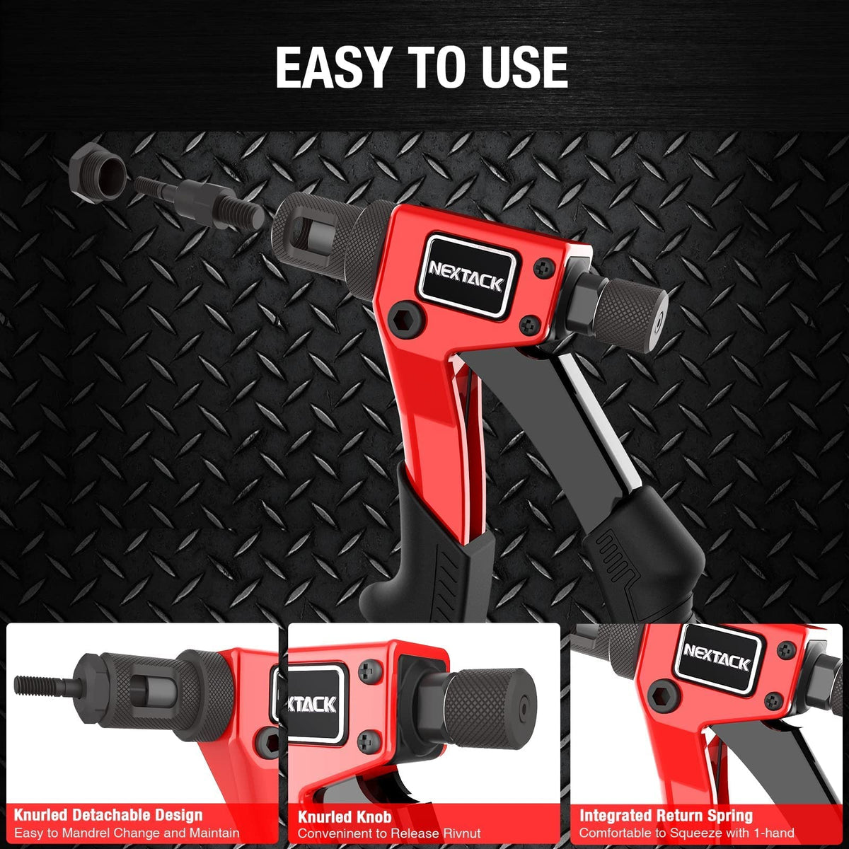About Nextack Just As Its Name Suggest, Nextack Strive To Create Continuous Solution At Nextack, We Committed To Produce Innovative And Quality Tools To Achieve Professional Productivity Enhancing Solutions, Which Enable Our Life Easier, Comfortable, And More Efficient About Nt600 Nextack Nt600 Features 8A High Strength Carbon Steel Arms Allowing A Single Hand Operating, Which Is Specially Designed For Tight Space Or Difficult To Reach By Dual Hand Riveting Equipped With A Step Drill Bit, 8Pcs Sae And Metric Interchangeable Mandrels And 80Pcs Rivnuts, It Offers One Stop Solution For Both Home Diyers And Professional Mechanics Drill, Insert, & Rivet Drill Your Pilot Hole, Insert The Rivet, And Squeeze Handle To Start Riveting Drill, Insert, Rivet Again It Makes Laborious Tasks Like Building A Deck Or Putting Up A Fence Go Much, Much Quicker Product Includes: 1 X Rivet Nut Gun 1 X Step Drill Bit 8 X Mandrels 4 Sae: 6-32, 8-32, 10-24, 14-20 & 4 Metric: M3,M4,M5, M6 80 X Rivet Nuts 10Pcseach Mandrel 1 X Wrench 1 X User Manual 1 X Storage Carrying Case Warm Notice: 1The Step Drill Bit Supplied Is Suitable For Workpiece Thickness Below 35Mm 2Please Select And Install Right Mandrel For Your Project Better To Practice Some Rivnuts In The Air To Know How Hard Or How Far To Pull Before Starting Your Project 3After First Squeeze Of Riveting, It May Be Not Well Finished Please Screw In The Knob For A 2Nd Squeeze Until Perfect Riveting 4Never Point The Rivnut Gun Towards Person, Including Yourself Keep Your Finger Away From The Handle Top In Riveting