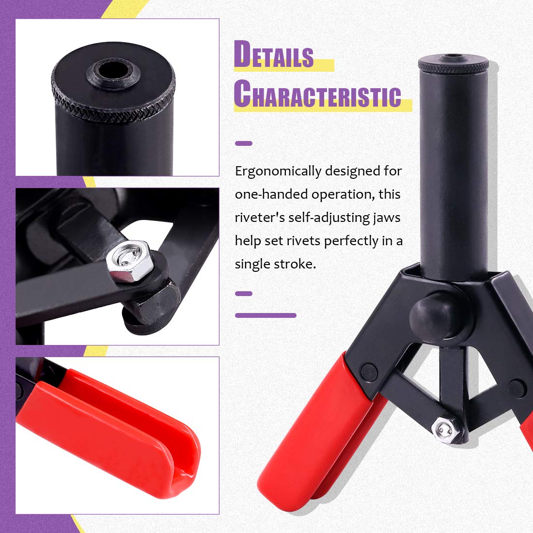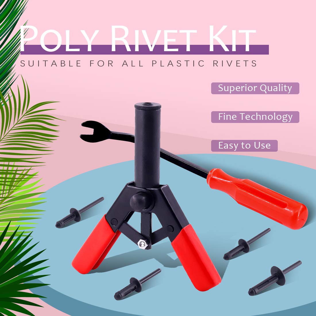 ? ? Swpeet 41Pcs Poly Rivet Gun Set with 1Pcs Rivet Removal Tool, Poly Rivet Tool for All Plastic Rivets Safe Metal or Plastic Clips Removal ? ? WHY CHOOSE US? v 1, Ergonomic ? Lightweight, designed for one hand operation with one-stroke without re-gripping. v 2, Long Reach Design ? Allows access in hard-to-reach areas, not accessible by lever type tools. v 3, Protects Surface ? Won’t damage painted door panels or easily marred automotive trim. v 4, Versatile Plastic Rivet Tool ? Universal nosepiece in rivet gun for plastic rivets of all sizes. v 5, Free Fastener Remover ? Steel shaft & convenient handle for safe metal or plastic clips removal. ? Package Included: ? 1Pcs -------------- Rivet Tool ? 1Pcs -------------- Rivet Removal Tool ? 10Pcs -------------- 5mm x 15.8mm Rivets ? 10Pcs -------------- 5mm x 17.2mm Rivets ? 10Pcs -------------- 6.6mm x 17.2mm Rivets ? 10Pcs -------------- 6.3mm x 25.2mm Rivets ? In Total 42Pcs Designed to set all sizes of poly rivets.
