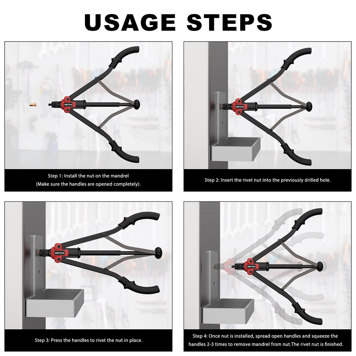 Q: How does the auto-release feature work on this rivet nut tool?A: The WETOLS Rivet Nut Tool features an auto-release nut design that allows the handle to automatically exit the nut once the riveting is complete, eliminating the need for manual unscrewing and making the operation quick and convenient.