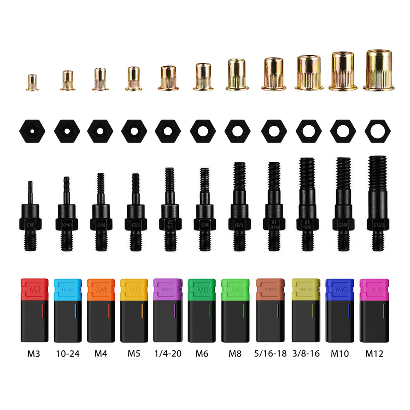 Q: What sizes of mandrels are included with the WETOLS Rivet Nut Tool?A: The WETOLS Rivet Nut Tool comes with 11 interchangeable metric and SAE mandrels, including sizes M3, M4, M5, M6, M8, M10, M12, and SAE sizes 10-24, 1/4-20, 5/16-18, and 3/8-16.