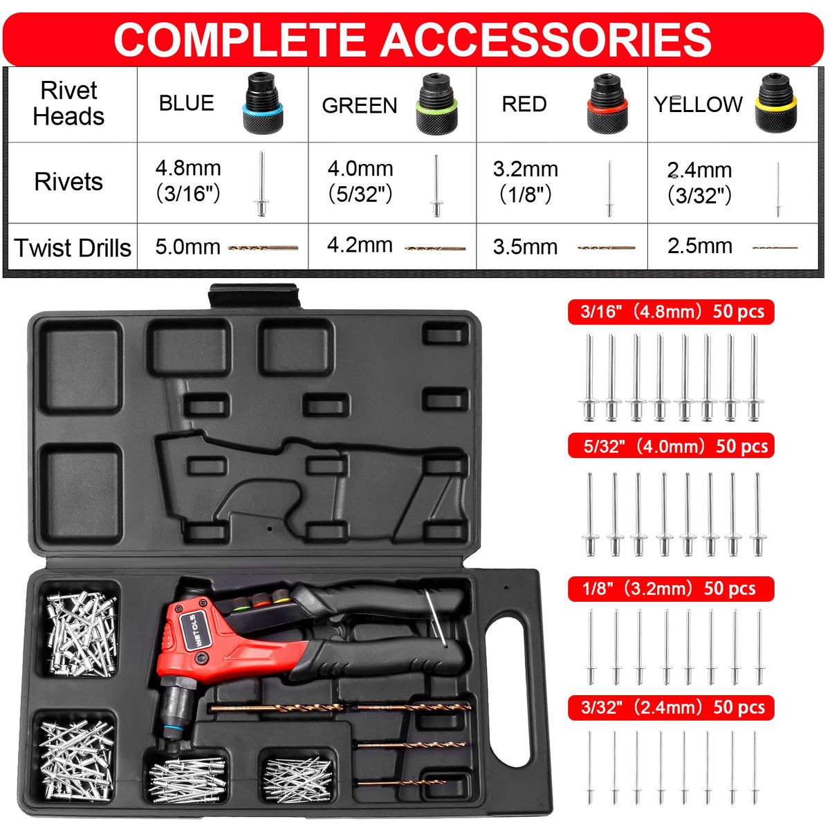 Wetols Pop Rivet Gun Kit With 200 Blind Rivets, Upgraded Manual Single Hand Riveter With 4 Tool-Free Interchangeable Rivet Heads