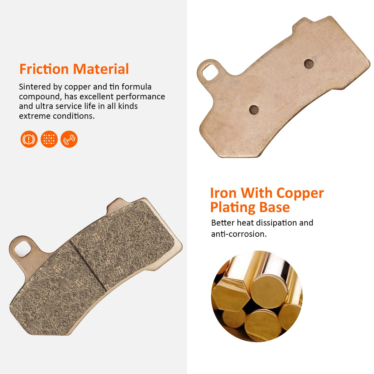 Q: What materials are used in these brake pads?A: The brake pads are made using a sintered formula that combines copper and tin, ensuring exceptional performance even in poor conditions. This material composition enhances durability and provides effective braking power.