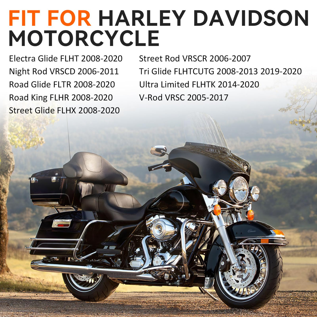 Q: What Harley Davidson models are compatible with these brake pads?A: These brake pads are designed to fit a variety of Harley Davidson models, including Electra Glide FLHT (2008-2020), Street Glide FLHX (2008-2020), Road Glide FLTR (2008-2020), Road King FLHR (2008-2020), as well as Street Rod VRSCR (2006-2007), Night Rod VRSCD (2006-2011), Tri Glide FLHTCUTG (2008-2013, 2019-2020), V-Rod VRSC (2005-2017), and Ultra Limited FLHTK (2014-2020).