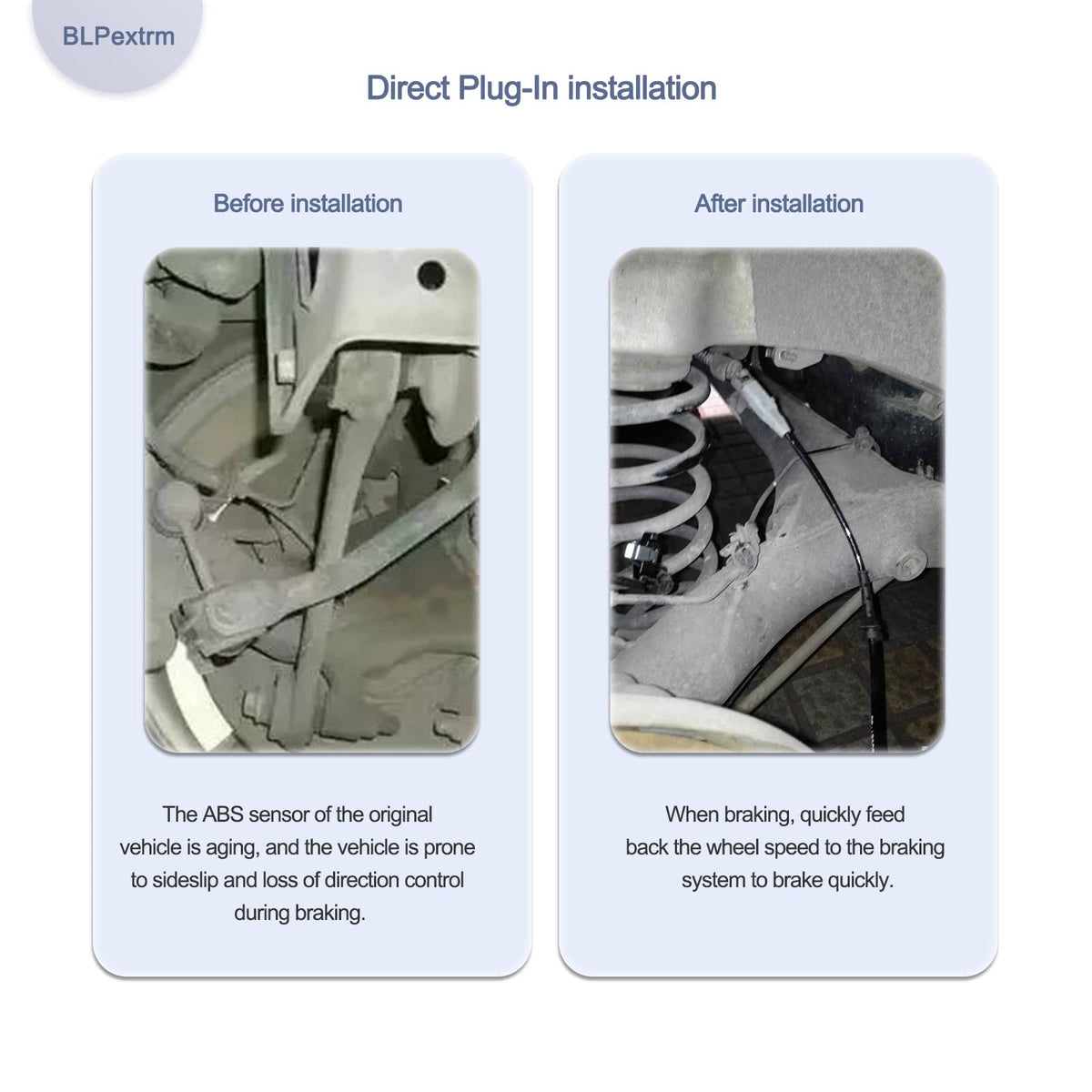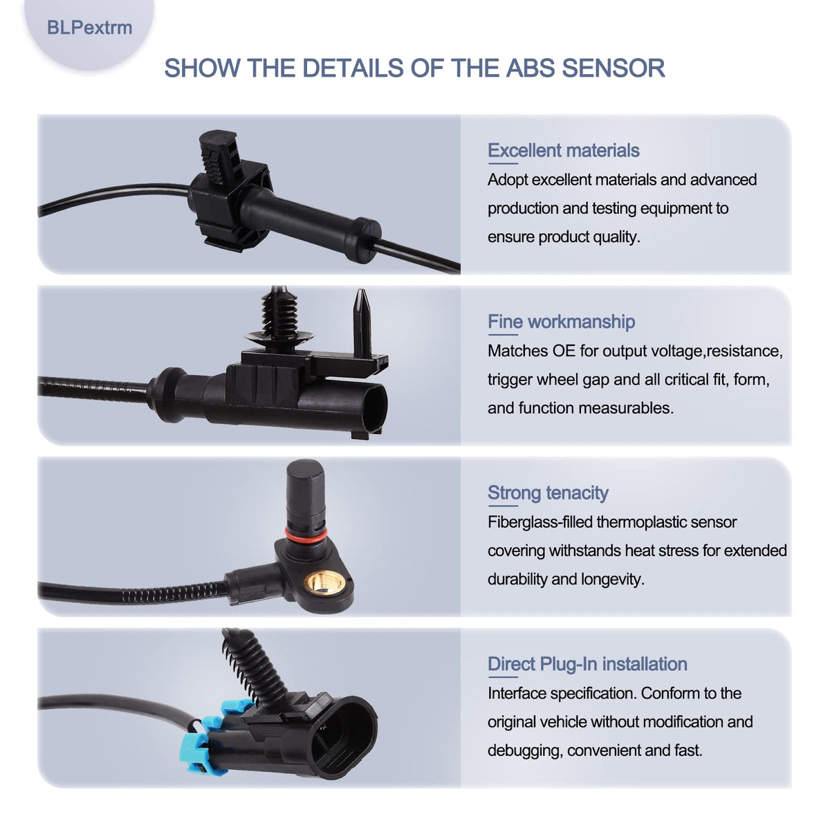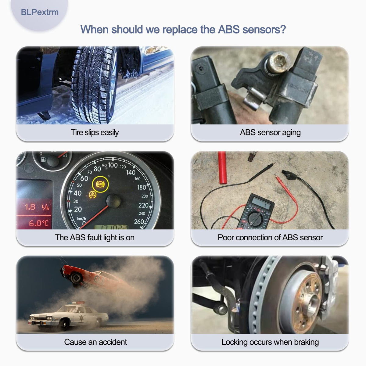 Introducation:BLPextrm Equipment ABS Wheel Speed Sensors are located at each wheel, monitoring the rotation of each wheel, and are recommended replacements for your vehicle's components. The sensor provides this speed information to the antilock brake control module for the antilock braking function.Features:1.BLPextrm ABS wheel speed sensors are manufactured under the highest standards. All sensors are tested by our QA department before the packing.2.This is item with Laser weld and Viton sealing system,Meet the professtional specification as replacement parts, for stable performance & durable.3.Matches OE for output voltage, resistance, trigger wheel gap and all critical fit, form, and function measurables.Benefit:?MONITORING SAFETY CONDITION?BLPextrm ABS Speed Sensor can the wheels from slipping and being locked during the braking process when it is determined that the vehicle is traveling on slippery road surfaces such as snow, ice, etc.?SLOW DOWN ENHANCE WHEEL WEARING?Effectively reduce braking distance, maintain steering control ability and improve steering stability to achieve reducing tire wearing effects.?EFFICIENTLY TRANSMIT WHEEL SPEED?ABS wheel speed sensor efficiently transmits the vehicle's wheel speed through the harness, back to the anti-lock brake system control module.Shorten the braking distance,it can effectively overcome the ''Deviation, sideslip and tail'' of emergency braking to the car from getting out of control.?SOLID ANTI-AGING ?BLPextrm ABS wheel speed sensor is sturdy and durable,able to cope with harsh working conditions and ensure driving safetyPackage includes:4x ABS Wheel Speed Sensor (Front Left, Front Right, Rear Left, Rear Right)