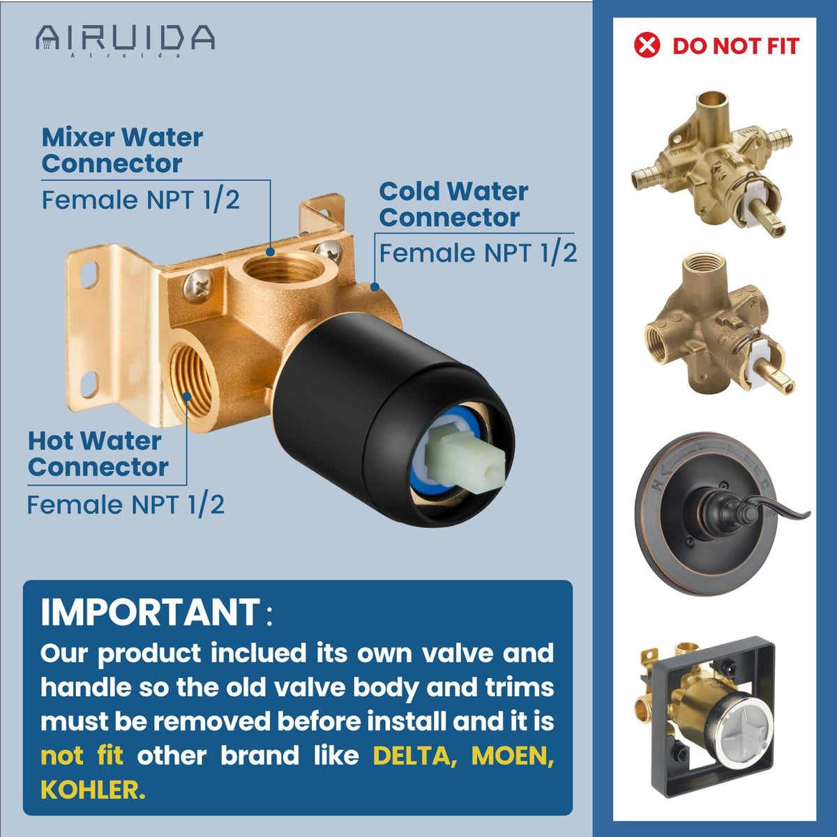 Q: Is the Airuida Shower Valve compatible with other shower systems?A: No, the Airuida Shower Valve is not compatible with valves and spools from other brands such as Delta or Moen. This kit is designed specifically for single-function shower systems and must be used with compatible components.