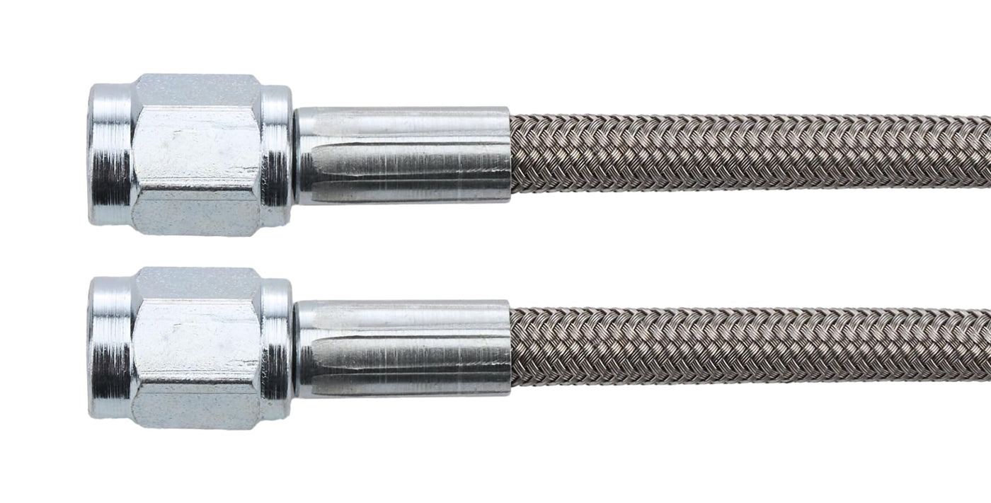 A wide selection of braided steel lines in various lengths All lines come with one straight end and your choice of straight 45 or 90 on the other end The inner PTFE hose is compatible with all brake fluids The braided stainless steel outer covering resists abrasion and corrosion Ideal for use where bending and flexing occur More durable than rubber hose Lengths stated are overall end to end including fittings