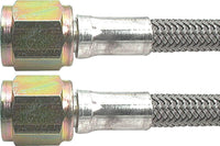 A wide selection of braided steel lines in various lengths. All lines come with one straight end and your choice of straight, 45 or 90 on the other end. The inner PTFE hose is compatible with all brake fluids. The braided stainless steel outer covering resists abrasion and corrosion. Ideal for use where bending and flexing occur. More durable than rubber hose.