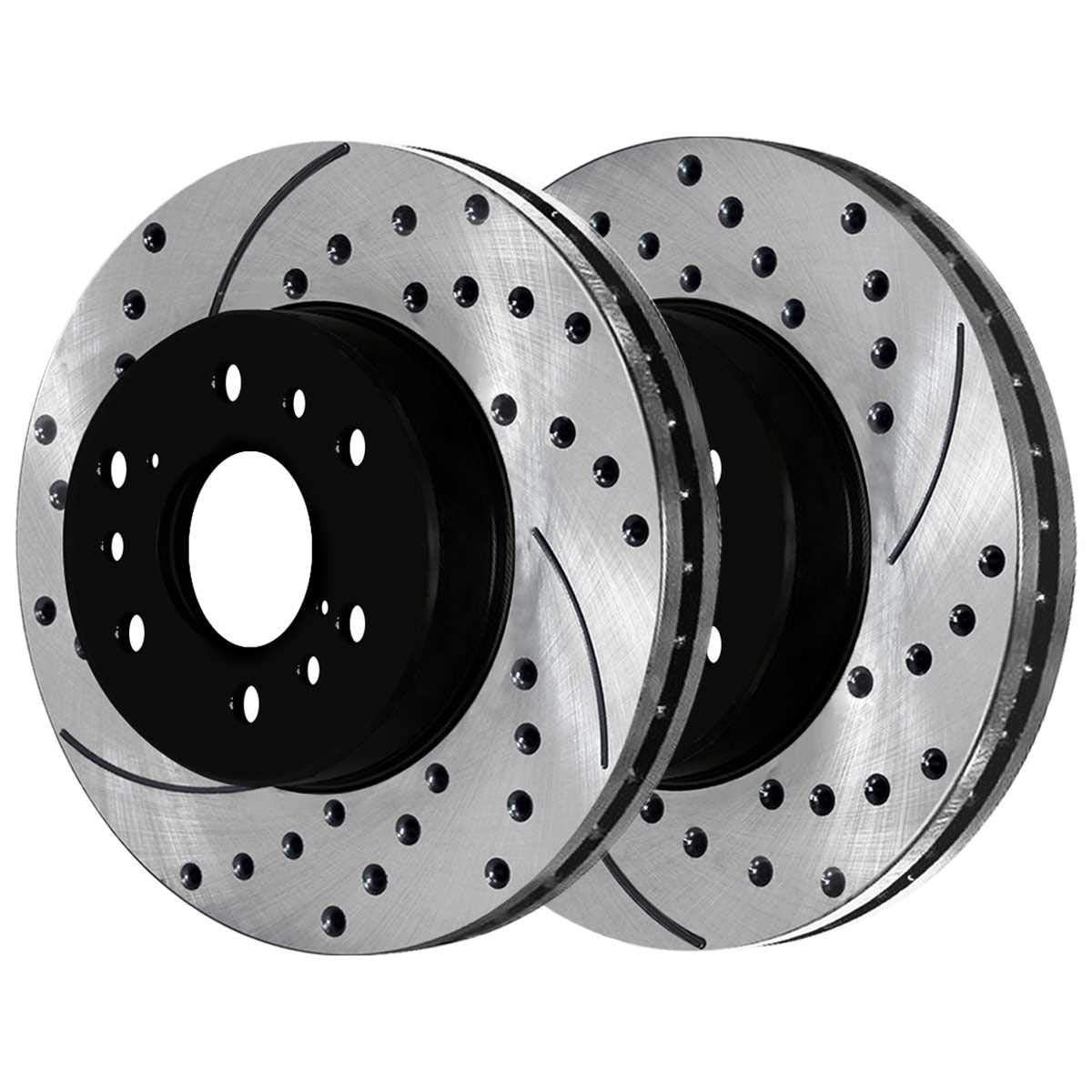 Q: What benefits do drilled and slotted rotors provide?A: Drilled and slotted rotors are designed to reduce heat and dirt buildup, enhancing braking performance. The ventilation helps maintain optimal braking temperatures, while the slots help expel gases and debris, leading to improved stopping power and reduced brake fade.