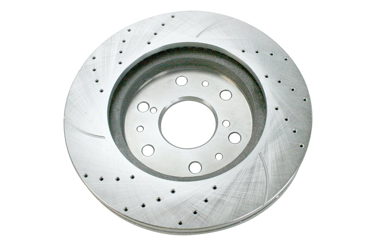 Q: What are the benefits of using drilled and slotted rotors?A: Drilled and slotted rotors improve braking performance by helping to keep the brakes cool and reducing dirt build-up. This design enhances the effectiveness of the brake pads and minimizes fading during heavy use.