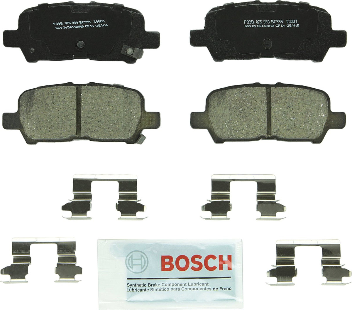 Today, one of every three Asian, Domestic, and European vehicles on the road in North America includes Bosch braking components. That's because Bosch has been a key player in the braking industry since applying for its first brake system design patent in 1936. The Bosch QuietCast line draws on this robust experience to deliver OE quality performance, industry-leading strength and durability, and exclusive innovations including Molded Shim Technology (MST). QuietCast pads feature the industry's best pre-attached OE style multilayer rubber core shims, ensuring the highest quality bond between rubber and steel, for lower noise, increased strength, and superior corrosion resistance. The proprietary Ceramic friction material is meticulously engineered to achieve superior performance, exceptional stopping power, and quiet operation with low dust. Corrosion and rust resistant powder-coated backing plates deliver increased product life. OE style slots and chamfers ensure premium quality, fit, and function. Set includes pads for 1 axle (2 wheels), hardware kit (where available), and synthetic lubricant for reduced resistance on sliding contact points. Compatible with select vehicles (Note: vehicle trim level may affect fitment - verify specific vehicle fitment details with fit checker above).