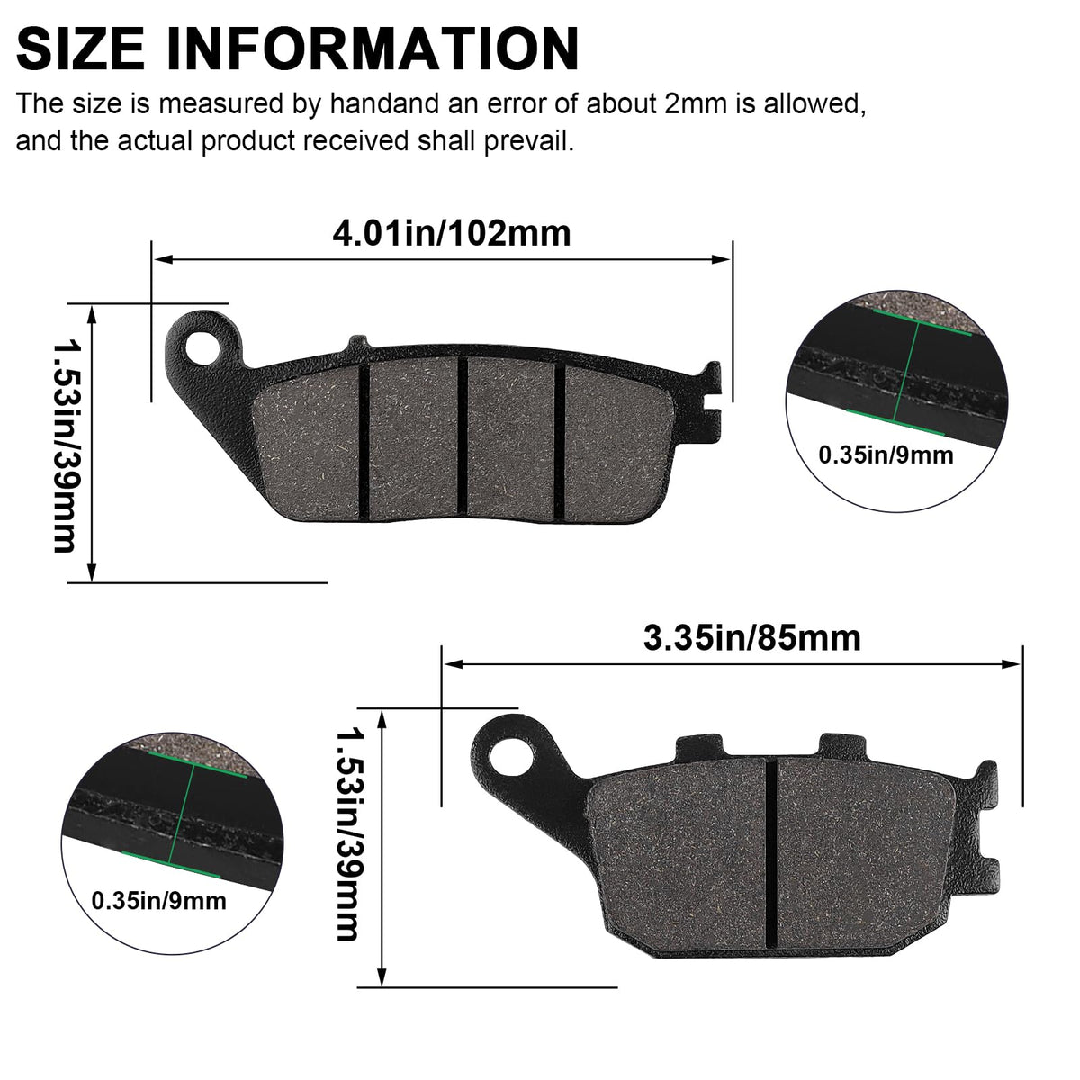 Q: What are the dimensions of the front and rear brake pads?A: The front brake pads measure 101 x 39 x 9 mm (3.98 x 1.54 x 0.35 inches), while the rear brake pads measure 86.5 x 41.5 x 10 mm (3.41 x 1.63 x 0.39 inches). Make sure to check these dimensions against your brake system for compatibility.