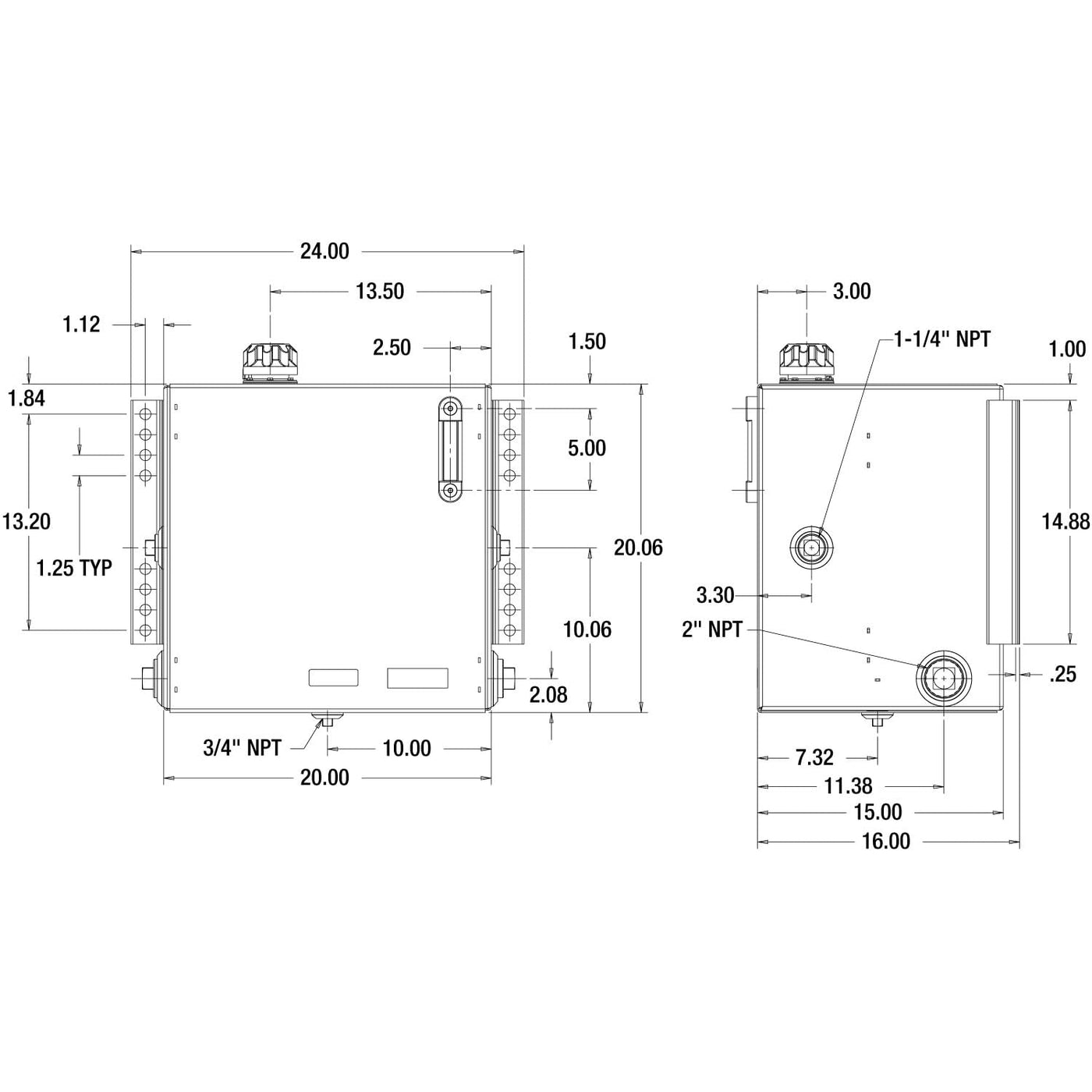Q: What are the dimensions of the Buyers Products SMR25S 25 Gallon Side Mount Steel Hydraulic Reservoir?A: The dimensions of the Buyers Products SMR25S hydraulic reservoir are 24.0 inches in length and 20.0 inches in width, making it suitable for installation on 1 ton trucks and smaller vehicles.