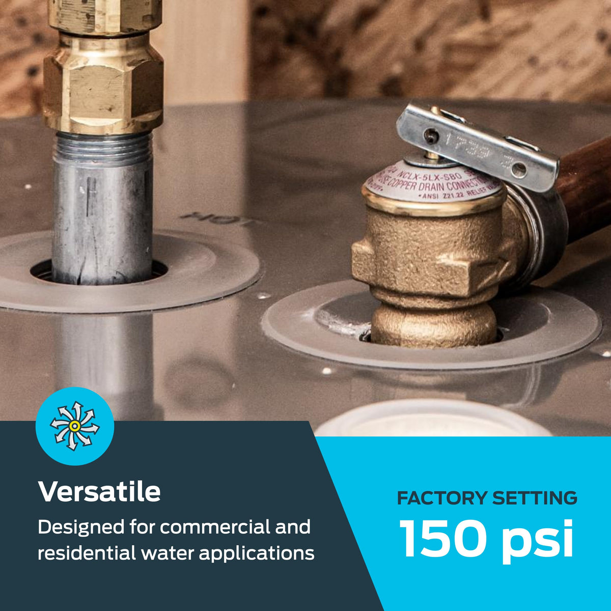 Q: What is the maximum water pressure this Cash Acme pressure relief valve can handle?A: The Cash Acme 3/4 Inch RV FWL-2 Pressure Relief Valve is designed for maximum intermittent water pressure of 150 PSI.
