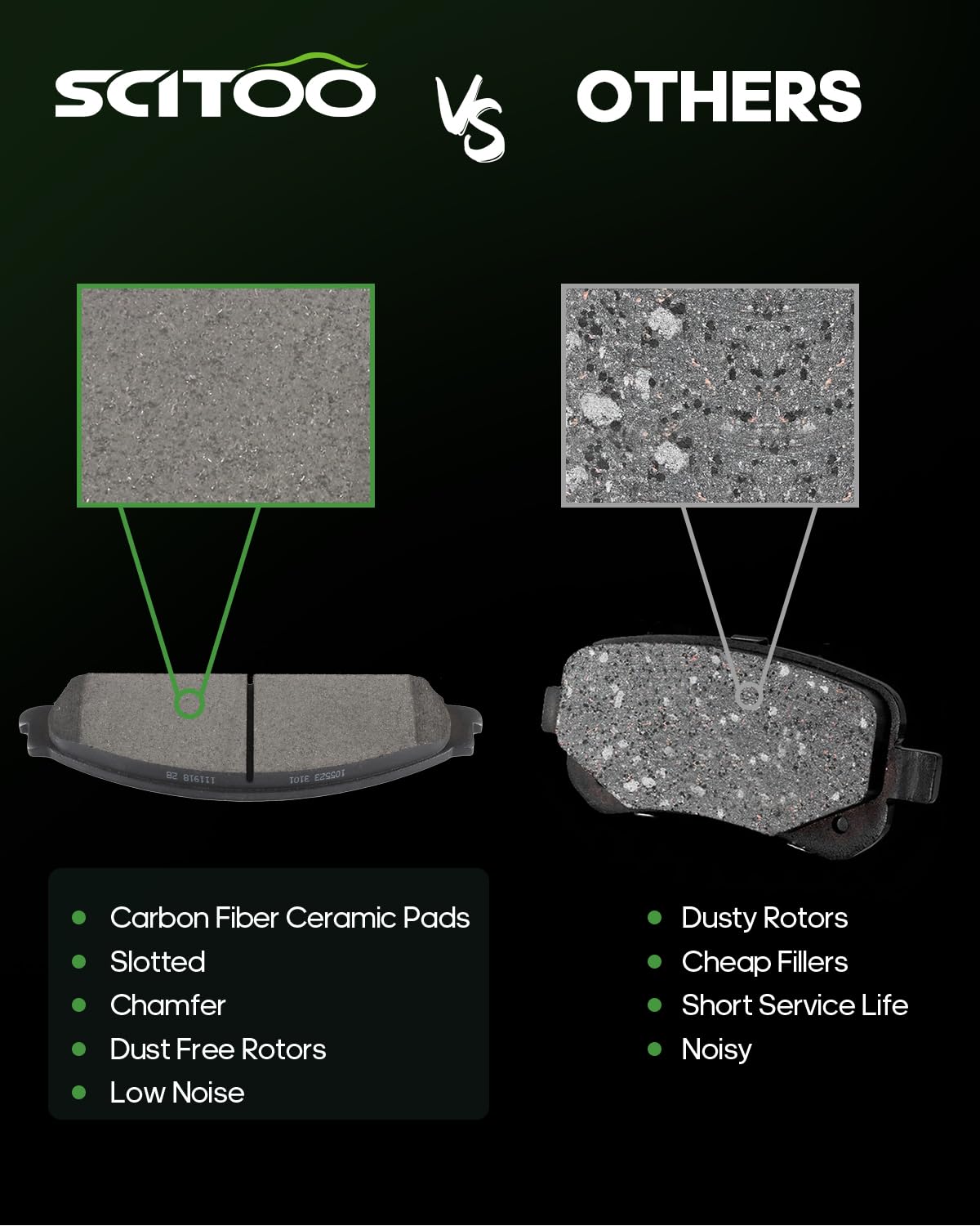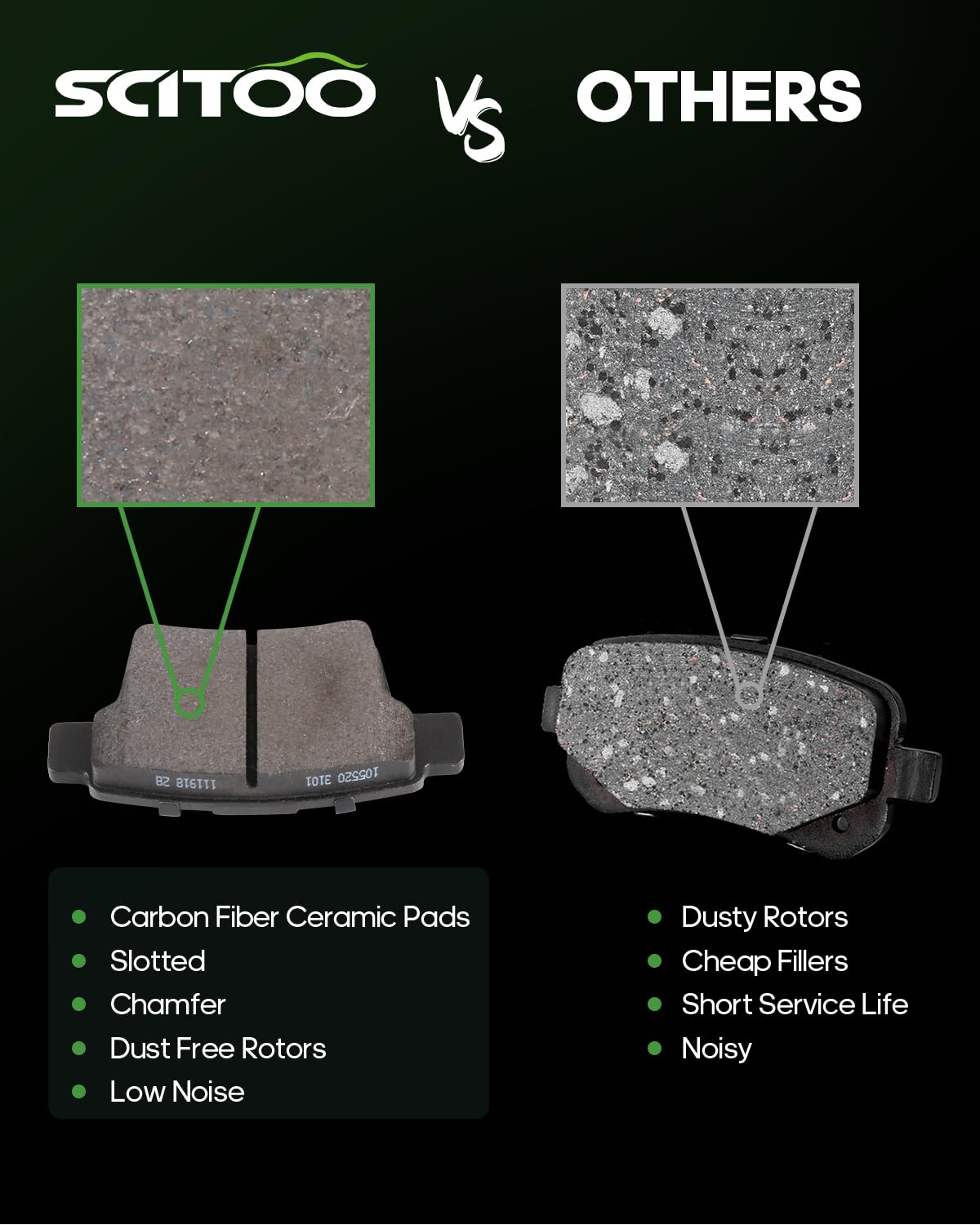 Q: What should I consider before purchasing the SCITOO brake pads?A: Before purchasing, ensure that your vehicle matches the compatibility specifications listed for the SCITOO Ceramic Brake Pads Kits, as the package contains 8 pieces and is designed for specific models.