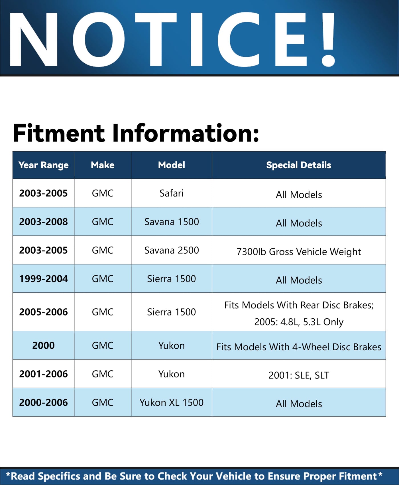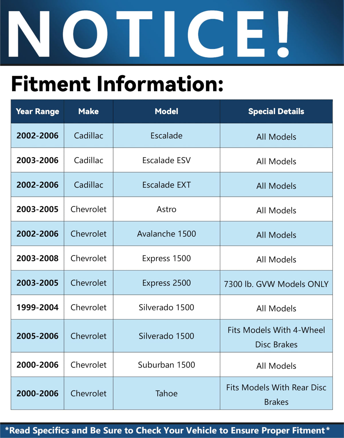 Q: What vehicles are compatible with the Detroit Axle Front Brake Kit?A: The Detroit Axle Front Brake Kit is designed to fit models with 12-inch (305mm) front rotors, including various Chevrolet, GMC, and Cadillac models. Notable compatible vehicles include the 2002-2006 Cadillac Escalade, 1999-2004 Chevrolet Silverado 1500, and 2000-2006 GMC Yukon XL 1500, among others. Always verify your vehicle's specifications to ensure compatibility.