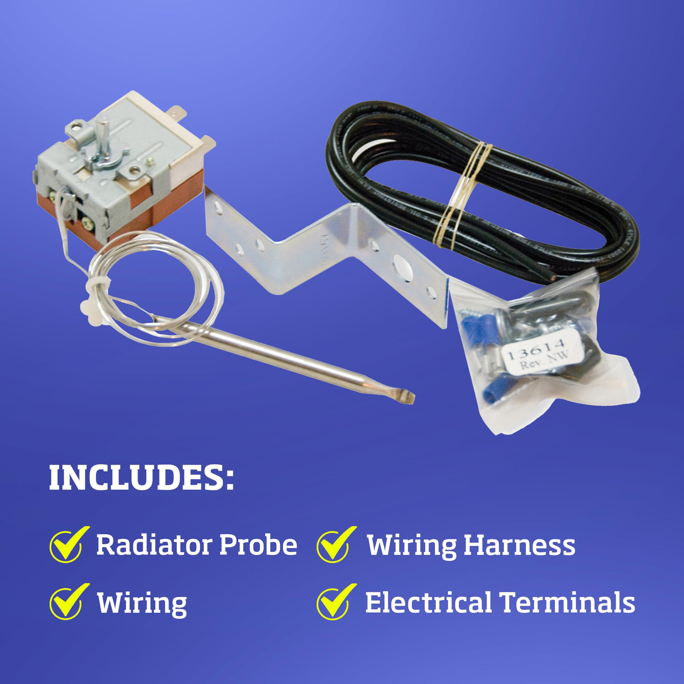 Q: What components are included with the Flex-A-Lite Adjustable Temperature Controller?A: The package includes a radiator probe, wiring harness, and electrical terminals, ensuring easy installation and setup for various automotive fan systems.