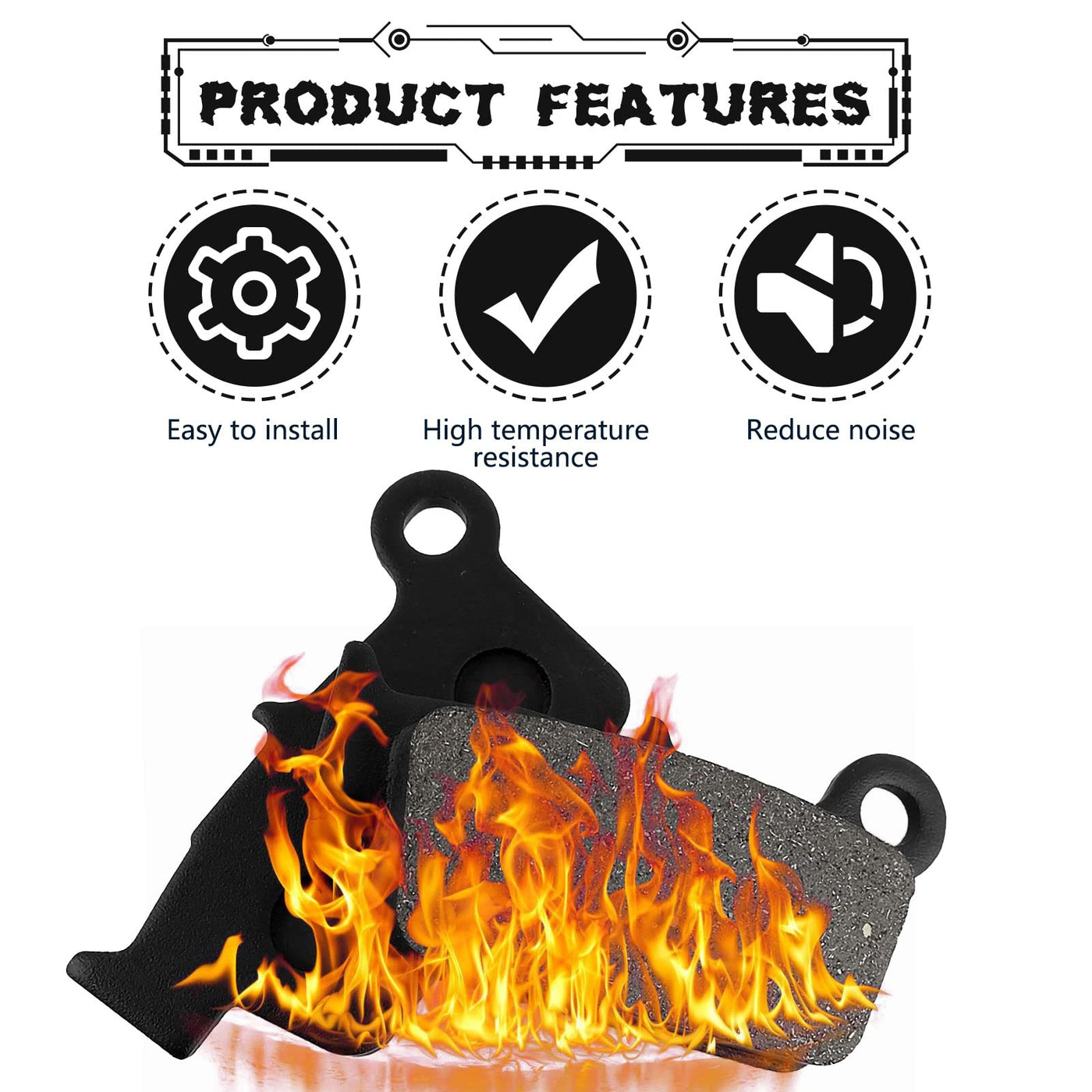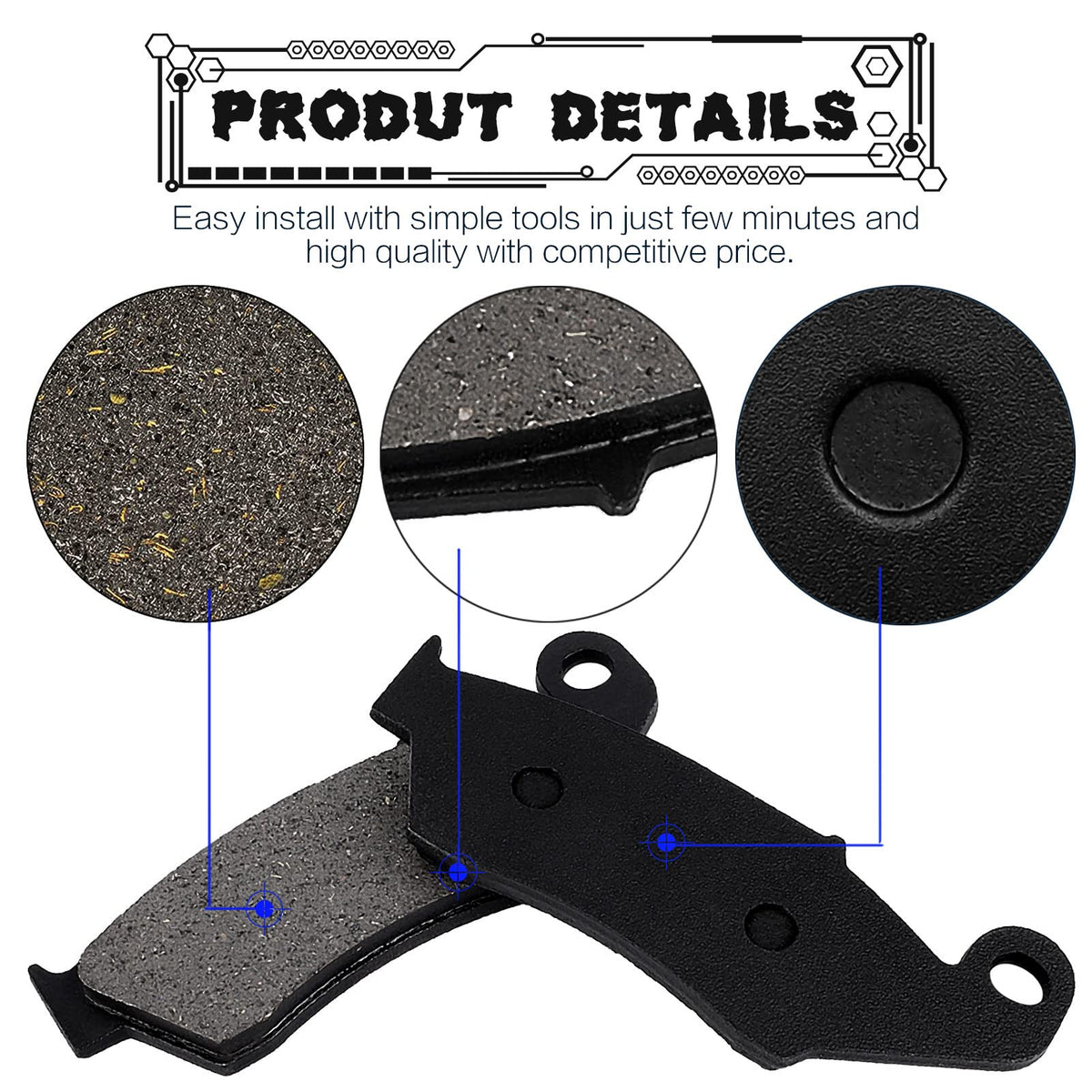 Q: What materials are used in these brake pads?A: These brake pads are made from a semi-metal and non-asbestos material, containing brass to enhance friction and high-temperature resistance.