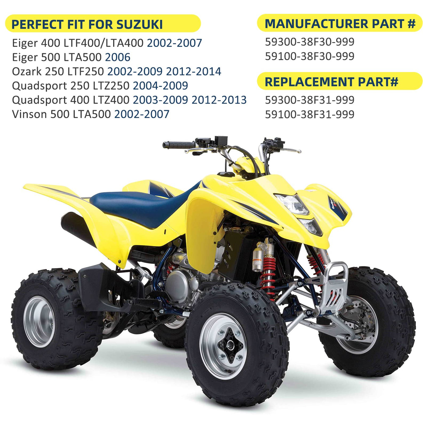 Q: What Suzuki ATV models are compatible with the M MATI Front Left Right Brake Calipers?A: The M MATI Front Left Right Brake Calipers are compatible with several Suzuki ATV models, including the Eiger 400 LTF400/LTA400 (2002-2007), Eiger 500 LTA500 (2006), Ozark 250 LTF250 (2002-2009, 2012-2014), Quadsport 250 LTZ250 (2004-2009), Quadsport 400 LTZ400 (2003-2009, 2012-2013), and Vinson 500 LTA500 (2002-2007).