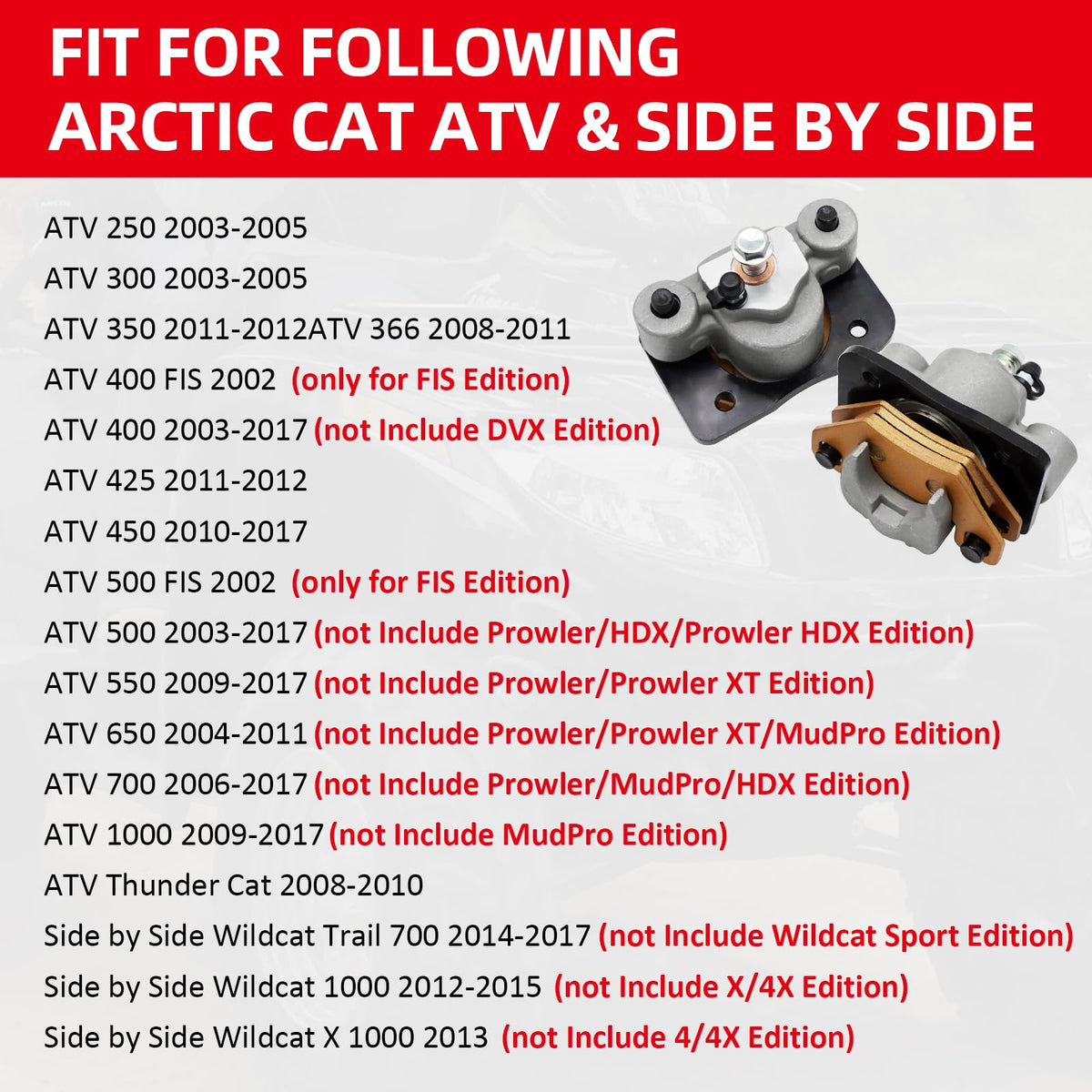 Manufacturer Part # 1436-423 1436-422Replacement Part# 3323-231 3323-230 3323-157 3323-156 2502-551 2502-550Package:Front Left Brake Caliper W/Pads 1Front Right Brake Caliper W/Pads 1Fit for Arctic Cat ATV and Side by Side as follows?ATV 250 2003-2005?ATV 300 2003-2005?ATV 350 2011-2012? ATV 366 2008-2011?ATV 400 FIS 2002 (only for FIS Edition)?ATV 400 2003-2017 (not Include DVX Edition)?ATV 425 2011-2012?ATV 450 2010-2017?ATV 500 FIS 2002 (only for FIS Edition)?ATV 500 2003-2017 (not Include Prowler/HDX/Prowler HDX Edition)?ATV 550 2009-2017 (not Include Prowler/Prowler XT Edition)?ATV 650 2004-2011 (not Include Prowler/Prowler XT/MudPro Edition)?ATV 700 2006-2017 (not Include Prowler/MudPro/HDX Edition)?ATV 1000 2009-2017 (not Include MudPro Edition)?ATV Thunder Cat 2008-2010?Side by Side Wildcat Trail 700 2014-2017 (not Include Wildcat Sport Edition)?Side by Side Wildcat 1000 2012-2015 (not Include X/4X Edition)?Side by Side Wildcat X 1000 2013 (not Include 4/4X Edition)