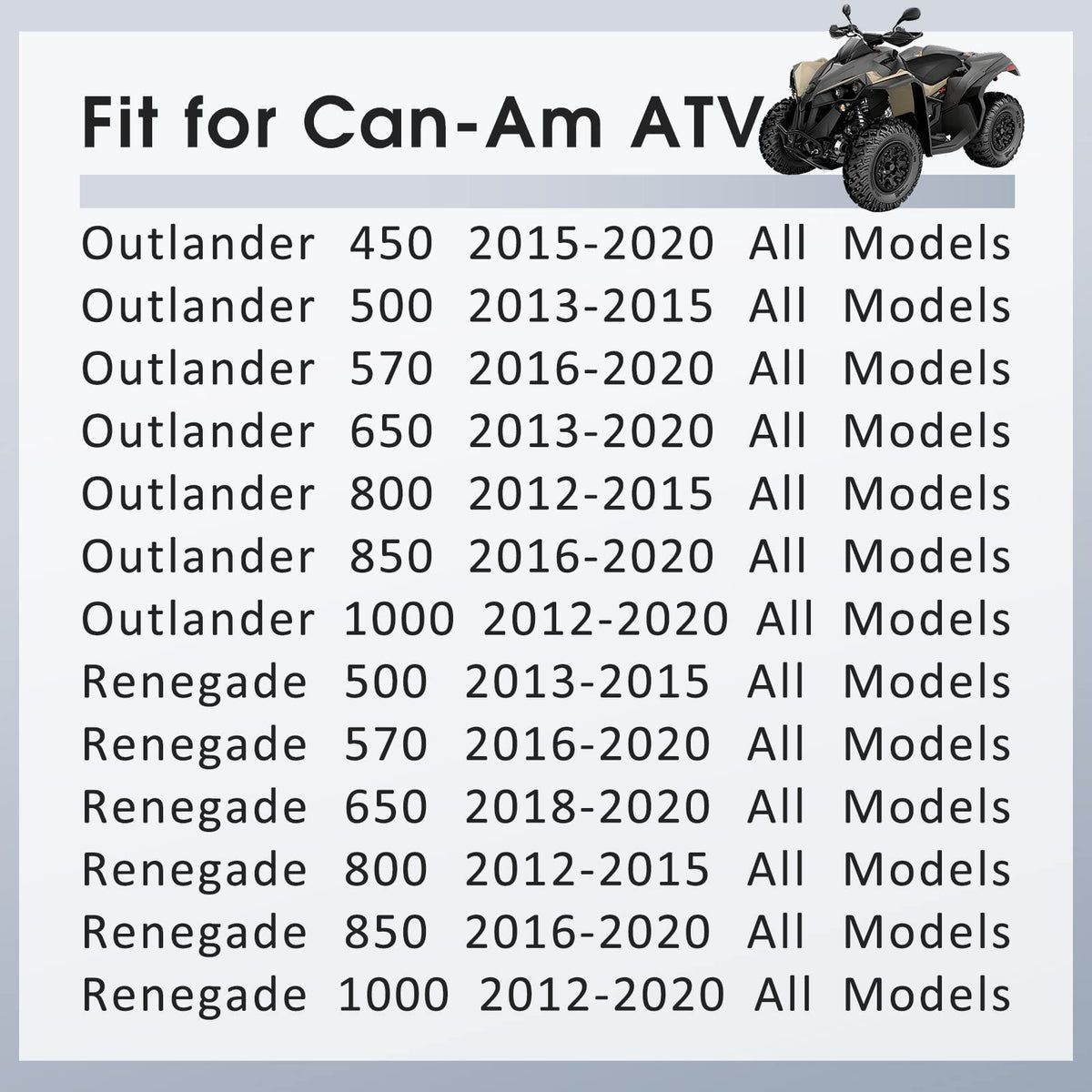 Manufacturer Part # 705600862 705600861 705600859 Repalcement Part# 703500968 703500967 703500969PackageFront Left Brake Caliper × 1Front Right Brake Caliper × 1Rear Brake Caliper × 1Front Left & Right And Rear Right Brake Caliper Fit For Can-Am Vehicle As FollowsOutlander 450 2015-2020 All ModelsOutlander 500 2013-2015 All ModelsOutlander 570 2016-2020 All ModelsOutlander 650 2013-2020 All ModelsOutlander 800 2012-2015 All ModelsOutlander 850 2016-2020 All ModelsOutlander 1000 2012-2020 All Models Renegade 500 2013-2015 All ModelsRenegade 570 2016-2020 All ModelsRenegade 650 2018-2020 All ModelsRenegade 800 2012-2015 All ModelsRenegade 850 2016-2020 All ModelsRenegade 1000 2012-2020 All Models