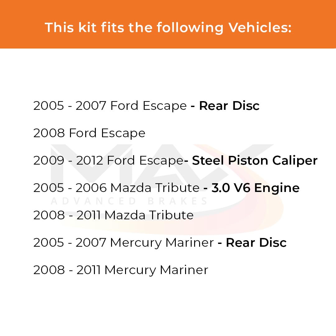 Q: What vehicles are compatible with the Max Advanced Brakes Front Brake Kit?A: The Max Advanced Brakes Front Brake Kit is compatible with various models including the 2005-2012 Ford Escape, 2005-2011 Mercury Mariner, and 2005-2011 Mazda Tribute, specifically for those with rear disc brakes.