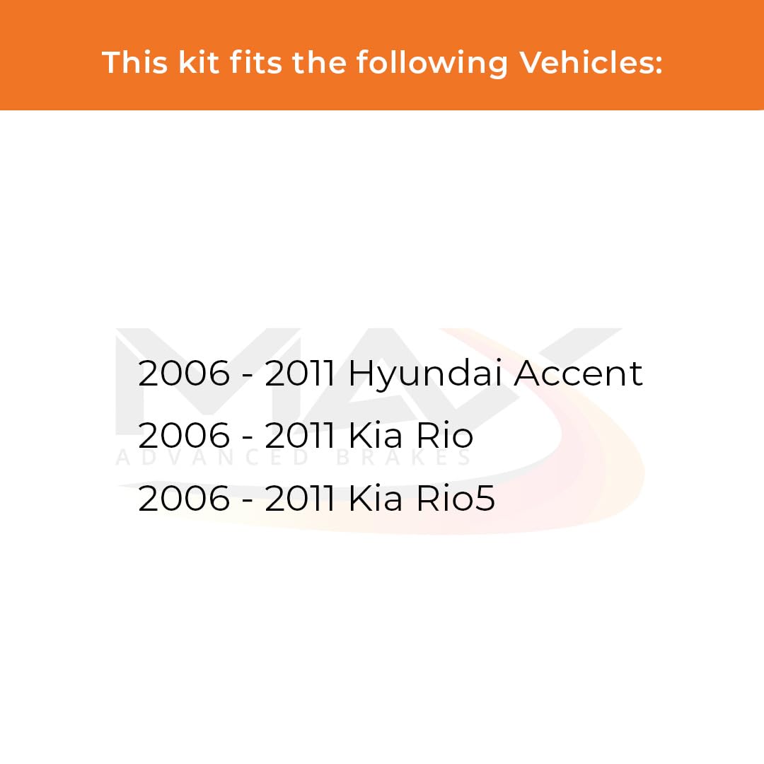 Q: What vehicles are compatible with the Max Advanced Brakes Front Brake Kit?A: The Max Advanced Brakes Front Brake Kit is compatible with 2006-2011 Hyundai Accent and 2006-2011 Kia Rio, including their respective sub-models. To ensure a perfect fit, please verify your vehicle's details such as year, model, and engine size before purchasing.