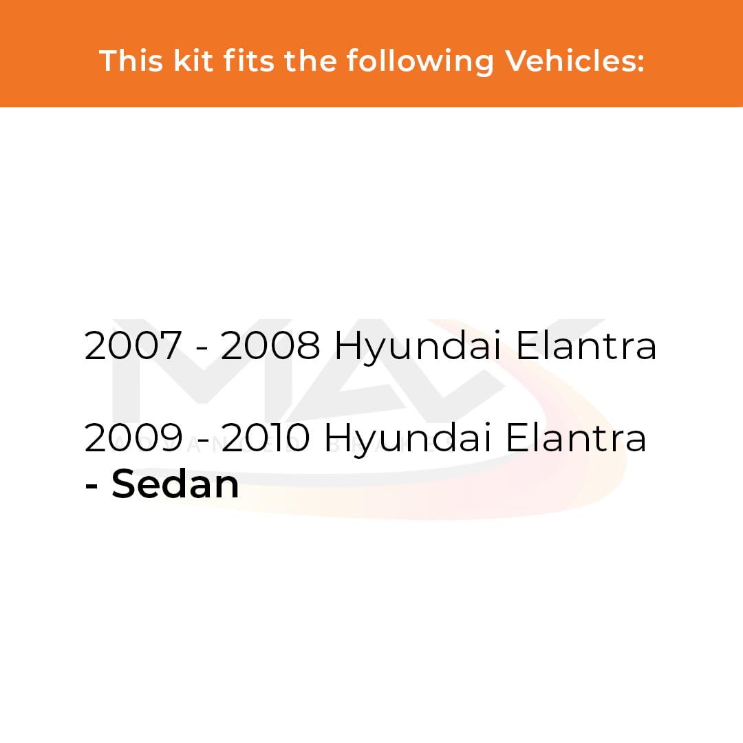 Q: What vehicles are compatible with the Max Advanced Brakes Front Brake Kit?A: The Max Advanced Brakes Front Brake Kit is specifically designed for the 2007 and 2008 Hyundai Elantra, as well as the 2009 and 2010 Hyundai Elantra Sedan. It is essential to confirm your vehicle's details, such as Year, Model, and Engine Size, before purchasing to ensure compatibility.