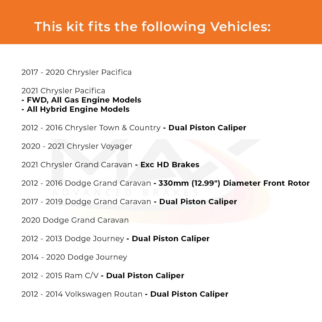 Q: What vehicles are compatible with the Max Advanced Brakes Front Brake Kit?A: The Max Advanced Brakes Front Brake Kit is compatible with the 2012-2020 Dodge Grand Caravan, 2012-2016 Chrysler Town & Country, 2017-2021 Chrysler Pacifica, and several other models including the 2014-2020 Dodge Journey and Volkswagen Routan, among others. It's essential to verify your vehicle's specifications to ensure proper fitment.